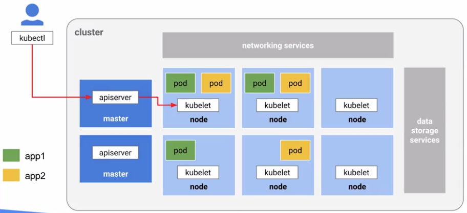 마스터 클러스터 서버는 kubelet을 실행중인 모든 노드들을 바라보고 있습니다. kubelet은 마스터와 자기자신의 노드와 통신하는 에이전트 역할을 한다.