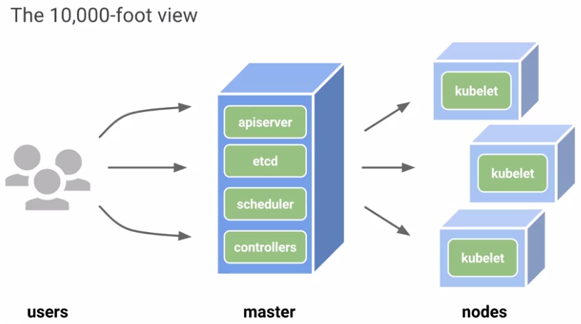 마스터 클러스터 서버는 kubelet을 실행중인 모든 노드들을 바라보고 있습니다. kubelet은 마스터와 자기자신의 노드와 통신하는 에이전트 역할을 한다.