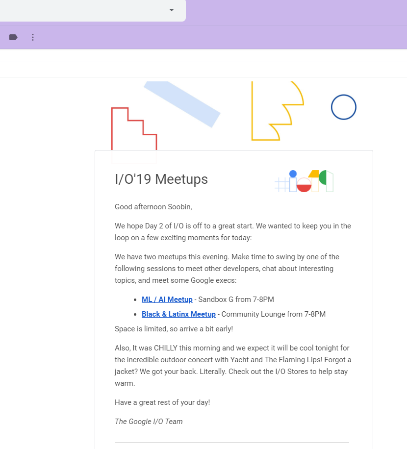 Google I/O 기간 동안 진행을 하다보면 가끔 저런 메일이 온다.