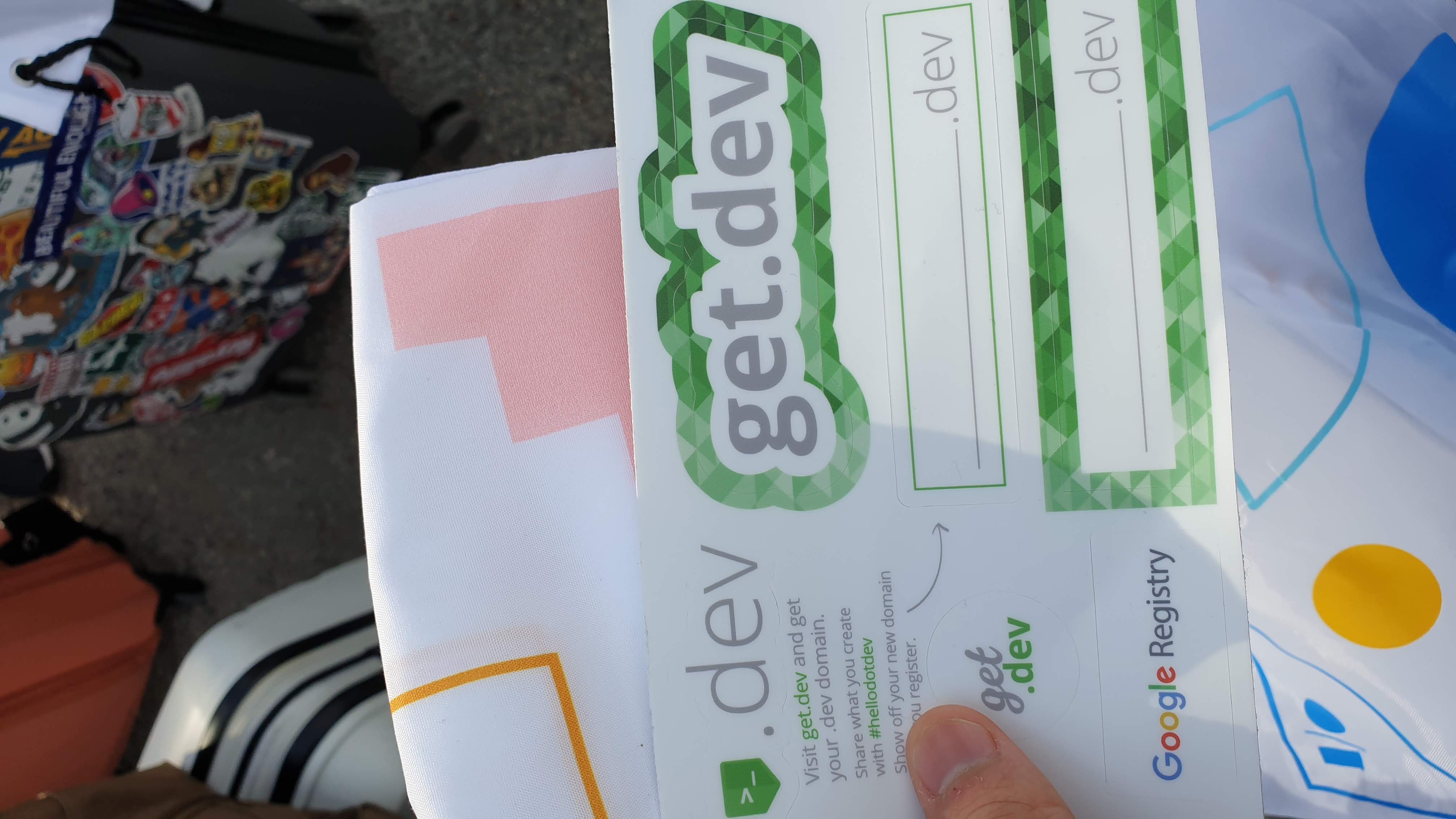 우선 .dev 라는 도메인으로 등록할 수 있다는 안내 스티커, 그리고 나름 큰 물병과, 티셔츠, 몇개의 자잘한 스티커와 썬크림을 제공해주었다.