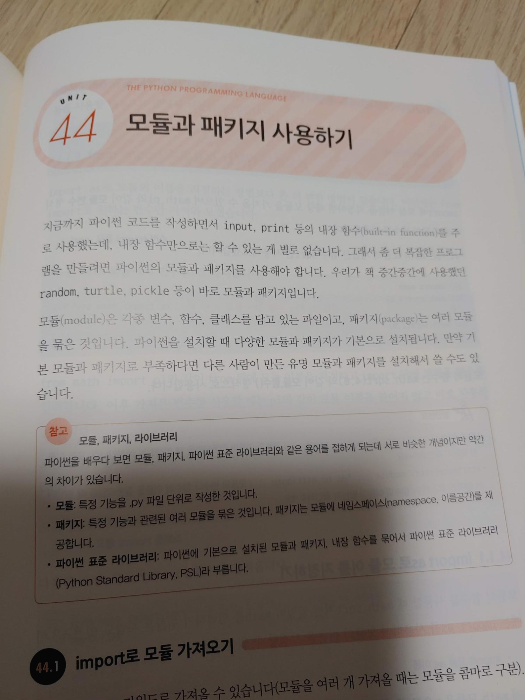 마지막 부분에는 어떠한 내용이 수록되어 있는지 살펴보았다. 모듈과 패키지에 대한 내용이다. 우리가 모듈을 잘 사용해야만 파이썬을 제대로 사용할 수가 있다. 모든 개발이 그렇듯이 라이브러리를 사용하지 않고 직접 모든 것을 개발하는 것은 불가능에 가깝기 때문이다. 또한 효율도 그렇게 좋지가 않다.