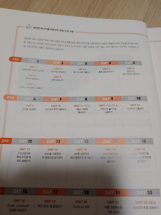 당연히 쉬운 부분으로는 변수와 리스트, 논리 연산자, 반복문과 조건문 등 프로그래밍의 기본 코스에 대해 살펴보도록 되어있다.