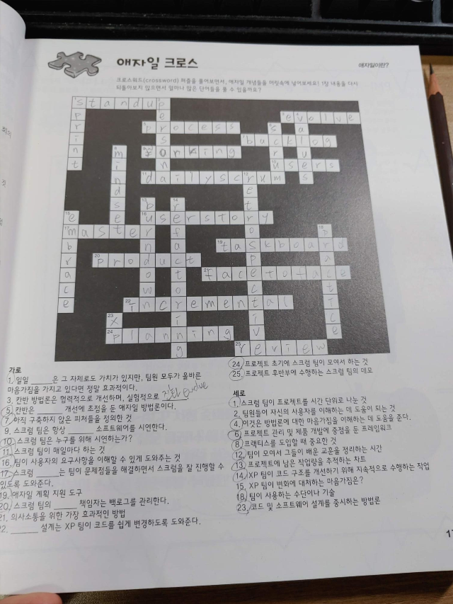 한글 번역본이지만, 크로스퍼즐은 영문으로 풀어야 했기에, 바로 단어가 나오지 않은 것도 적어야 했다.
