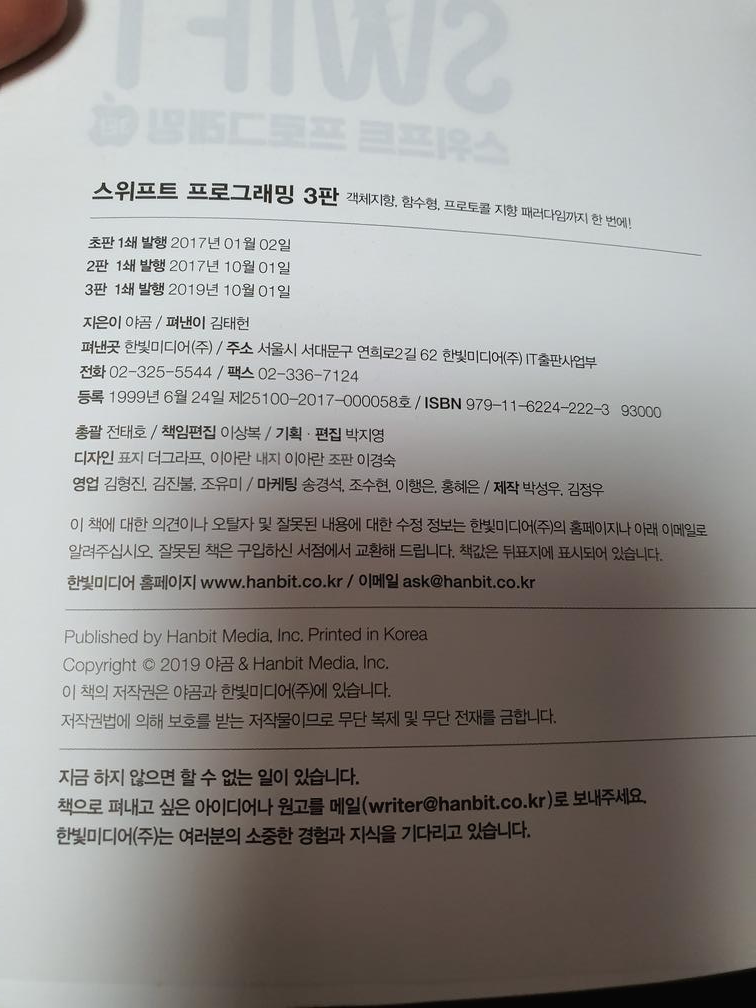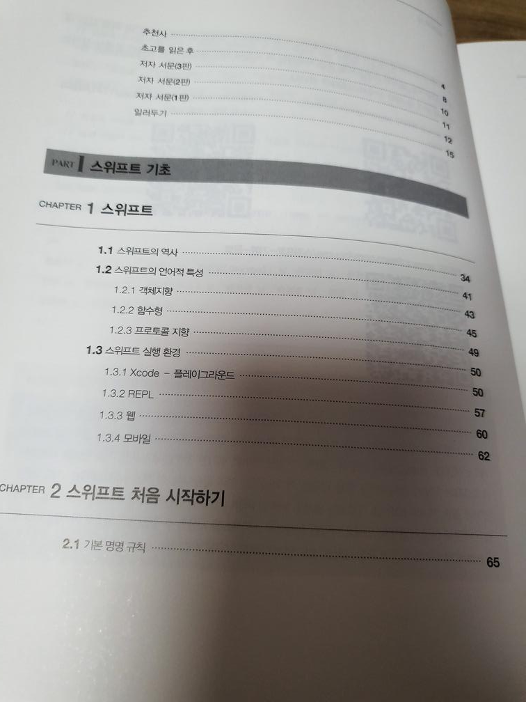 앞에서 언급했듯이 이 책은 같은 책의 3판이다. 각 판마다 색이 다르게 되어있기 때문에 이러한 부분은 괜찮은 도입이라고 생각이 든다. 각각 스위프트 3, 스위프트 4, 스위프트 5를 다루고 있다.