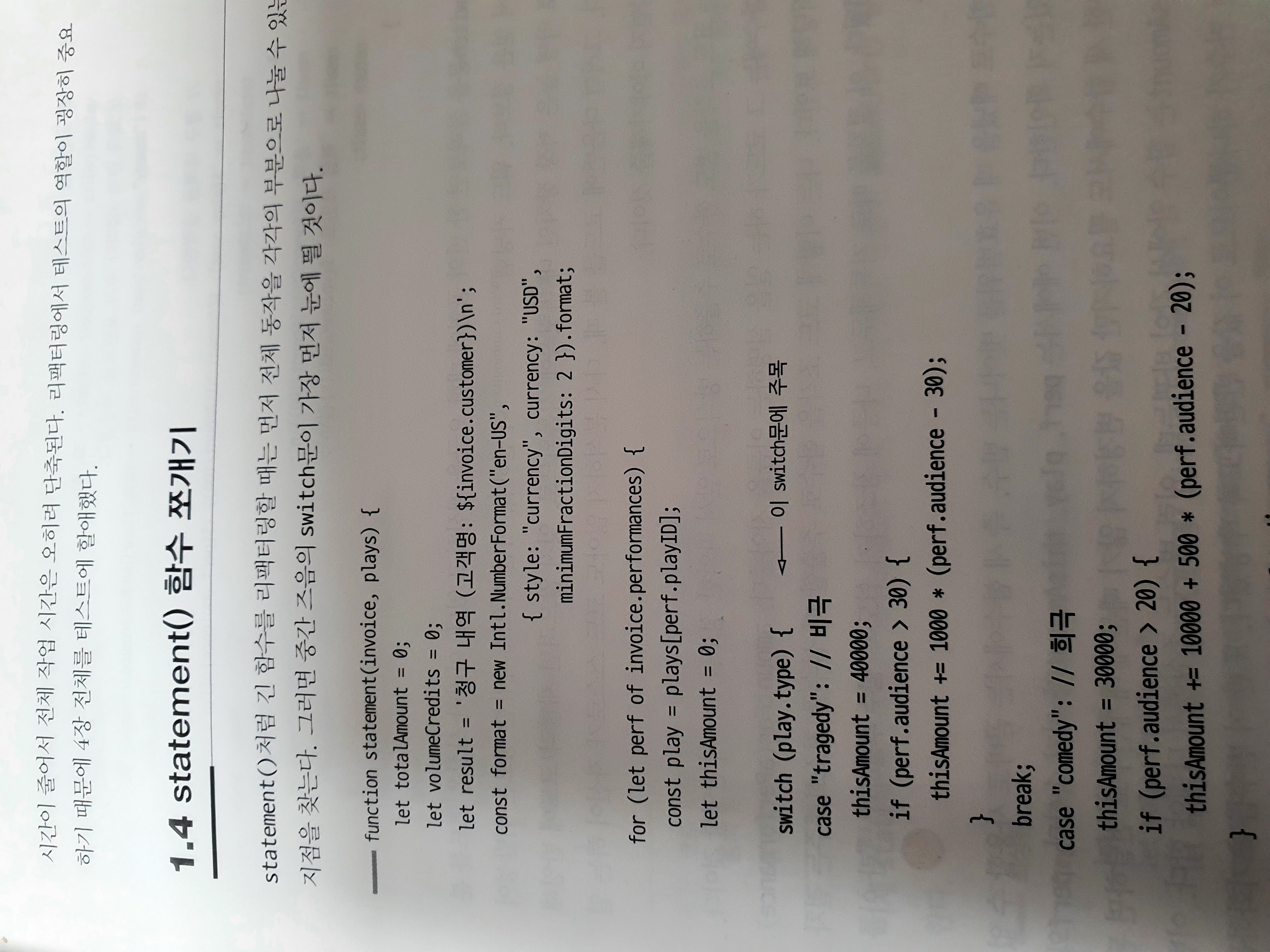 첫번째, 이 책을 시작하는 단계에서는 연극 공연료를 출력하는 메소드인 statement() 라는 하나의 메소드를 중심으로 리팩토링 해 나가는 절차를 예시로 보여준다. 겉보기에 별 문제가 없어보이는 코드이지만 이 코드를 더욱 변경이 용이하게 만들고, 이해가 쉽도록 만드는 절차가 되어간다. 전제조건으로는 테스트 코드를 만드는게 필수라고 이야기 하고 있다. 일단 하나를 맛보고 시작하는 데에서는 괜찮다고 여겨지기 때문에 직관적이었다.