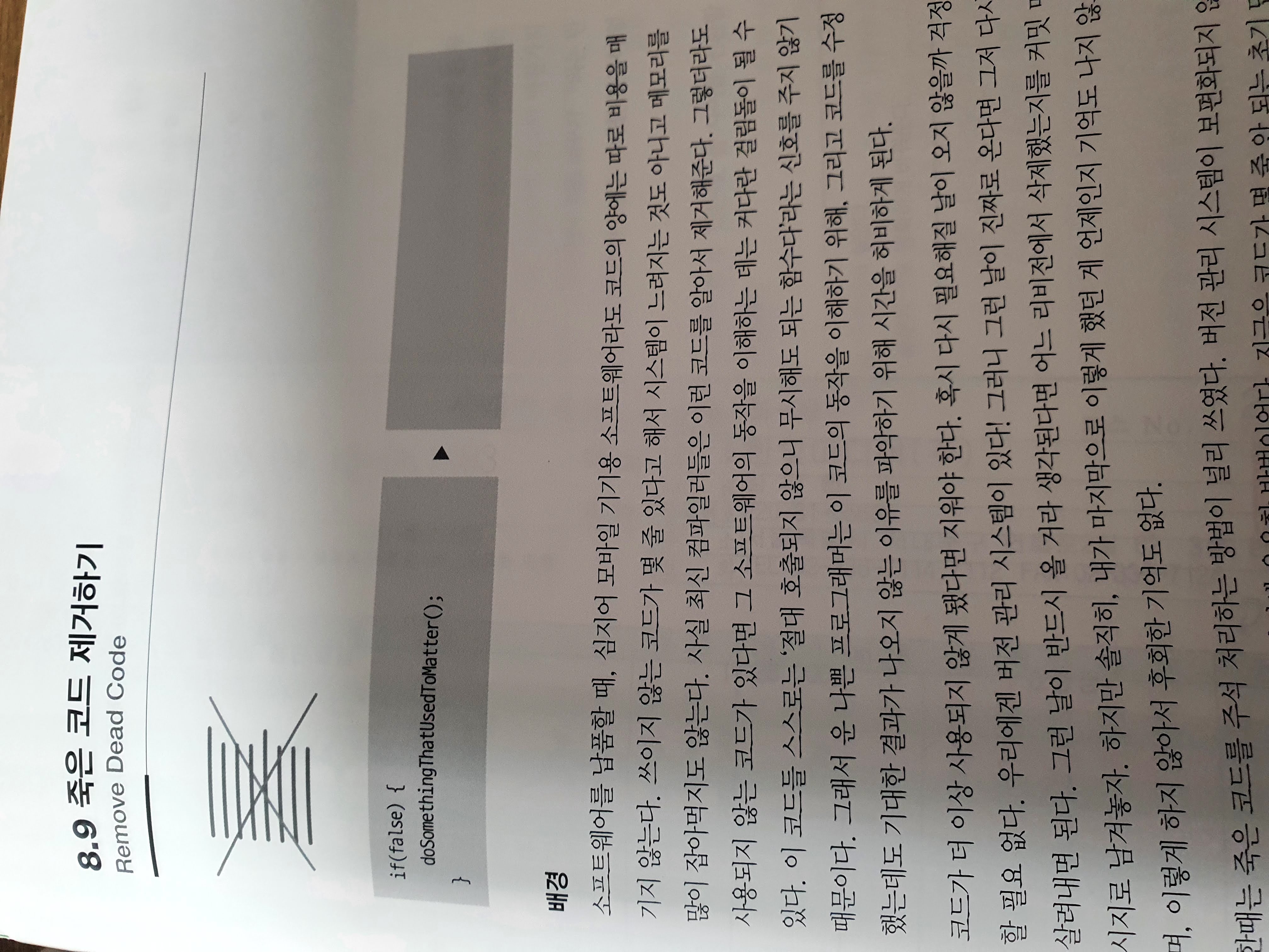 덤으로 이것은 죽은 코드를 제거하는 것도 나와있어서 흥미롭다고 생각했다. 사실 10년전만 해도 죽은 코드는 잘 관리하는게 히스토리 관리상으로도 중요했다. 하지만, 현재는 VCS가 너무나도 잘 되어있고, 그래서 사실 죽은코드는 잘 쳐내는 것이 중요하다는 것을 알려주고 있다. 시대의 흐름에 따른 부분이라고도 할 수 있을 것이다. 좀 더 깔끔한 코드가 후에 유지보수를 잘 하도록 돕는다고 알려주고 있다.