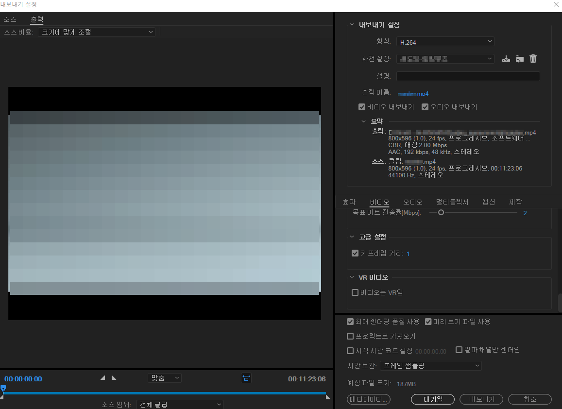 일단 위에서 형식을 지정하고 나면, 아래의 효과,비디오,오디오 등의 메뉴가 다시 설정되는데, 그 곳 중에서 비디오 메뉴로 이동한다. 그래서 비트레이트 설정이나 기타 필요한 설정은 알아서 하고, 가장 중요한 고급설정인 키프레임 거리 설정을 한다. 이것이 보통 20~60사이쯤의 값으로 설정되어 있을텐데, 이것을 1로 설정한다.(이렇게 한다고 용량이 늘거나 하지 않기 때문에 편하게 늘려도 된다. 늘린다는 의미는 값을 최소값인 1로 줄인다는 뜻이다.)