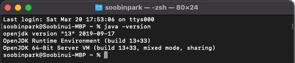 JDK가 설치가 되어있지 않다면 설치해준다. 만약 설치되어있는지 확인하고 싶다면, 터미널에 가서 'java -version'을 입력하면 확인이 가능하다.