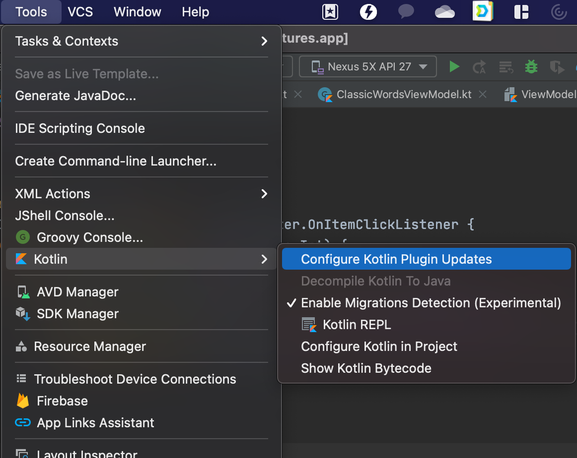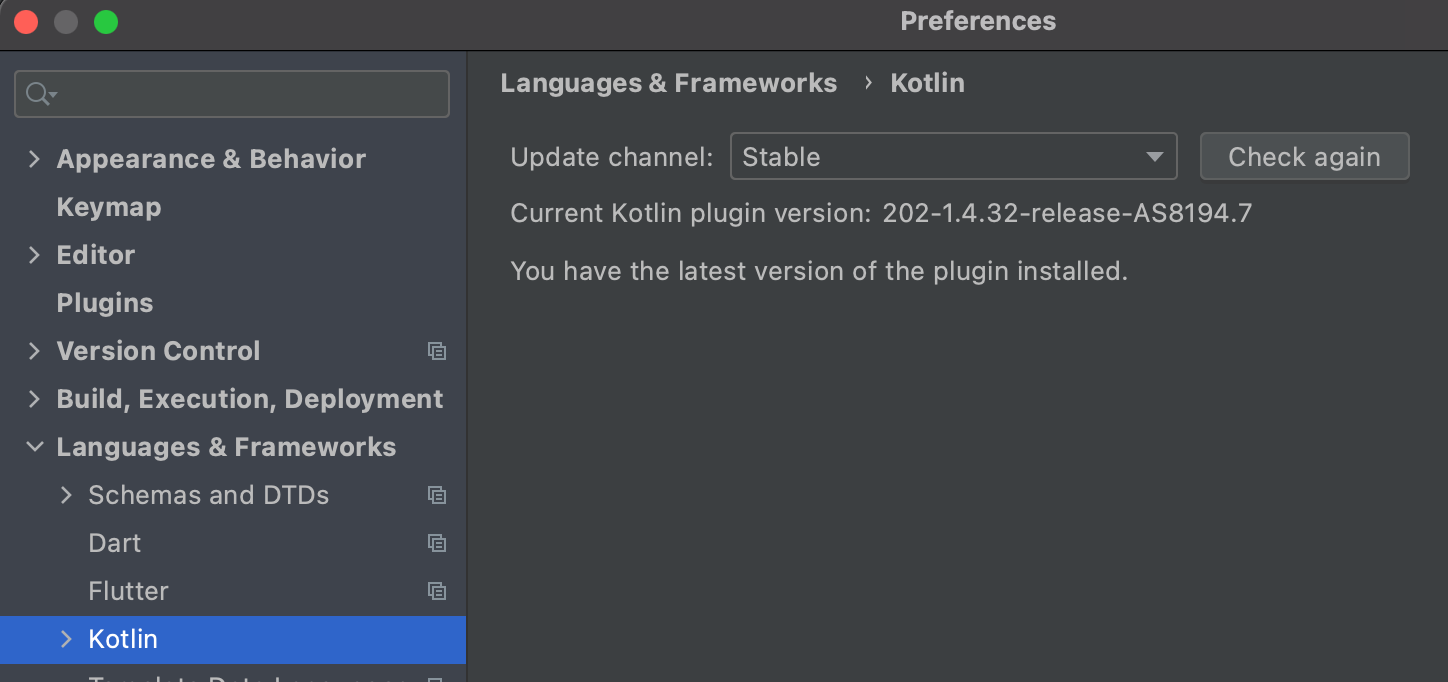 Android Studio에서 Tools | Kotlin | Configure Kotlin Plugin Updates에서 현재 Kotlin Plugin 버전을 확인한다. 필요한 경우 Stable update channel에서 최신 버전으로 업데이트 한다.