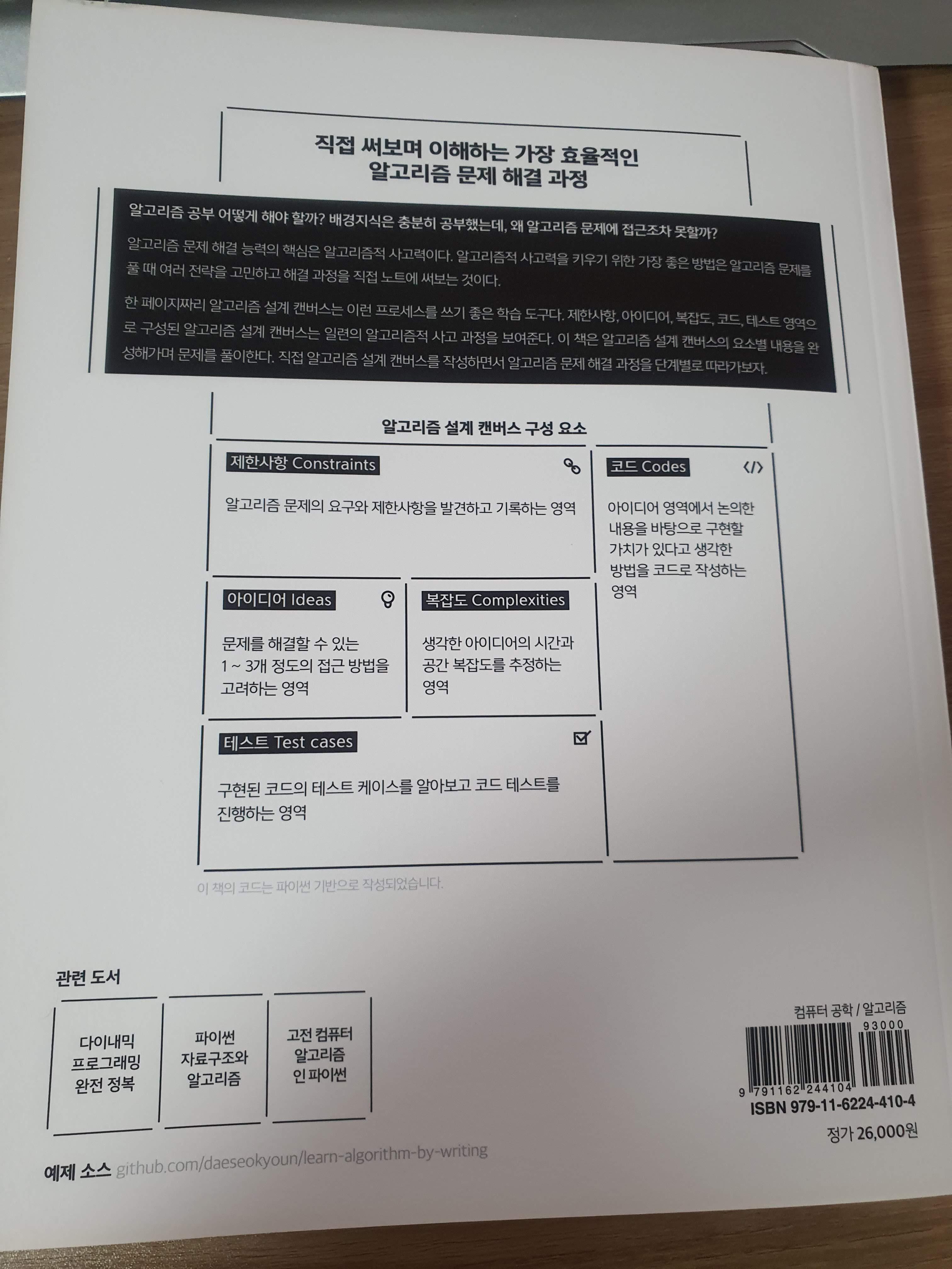 이 책의 핵심인 알고리즘 설계 캔버스를 중심으로 뒷 표지를 내세웠다. 책을 읽을수록 이유가 와 닿는 부분이다.
