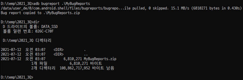 그리고 다음과 같이 커맨드 명령을 입력해준다. 그렇게하면 현 시점 기준으로 버그리포트를 위한 파일이, 입력한 이름의 zip 파일로 생성된다. 생성되는데 걸리는 시간은 고사양폰 기준으로 보더라도 약 3분정도는 걸리는 것 같다.