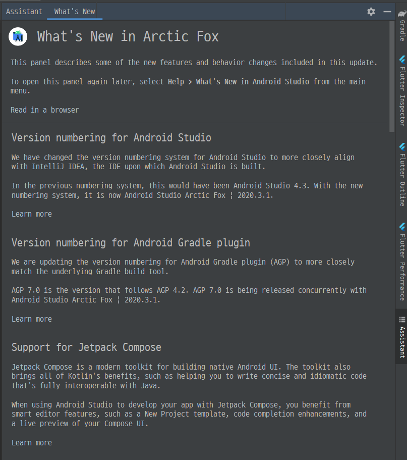 이 Arctic Fox에 관련해서는 아래에서 다시 정리를 하겠지만, 이 업데이트부터 Android Studio에 영문이름이 붙여지게 된다.
