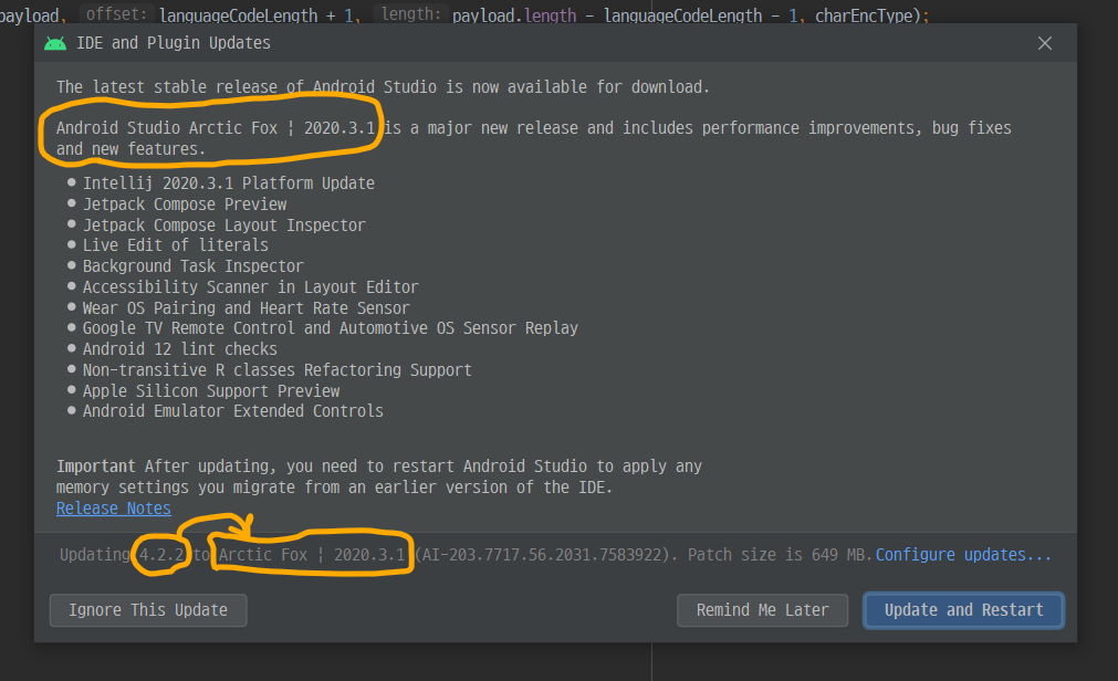 오늘도(?) 안드로이드를 공부해보기 위해 Android Studio를 켜서 진행하려고 하던 차에, Android Studio의 업데이트 건이 있다는 알림을 오른쪽 하단에서 발견했다.