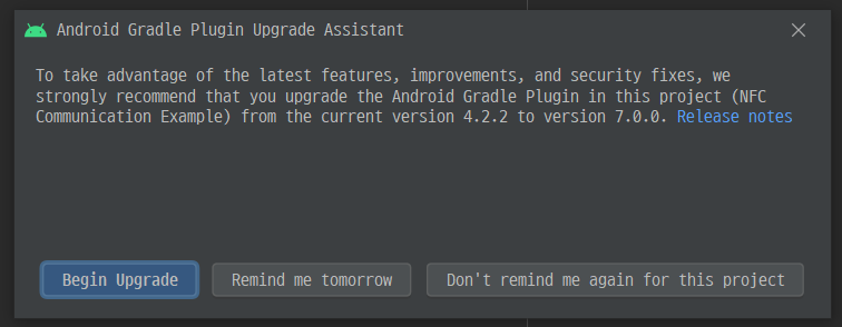 업데이트를 완료한 이후에는 옵셔널하게 Android Gradle Plugin도 7.0.0으로 업데이트가 가능하다는 안내가 나왔다.