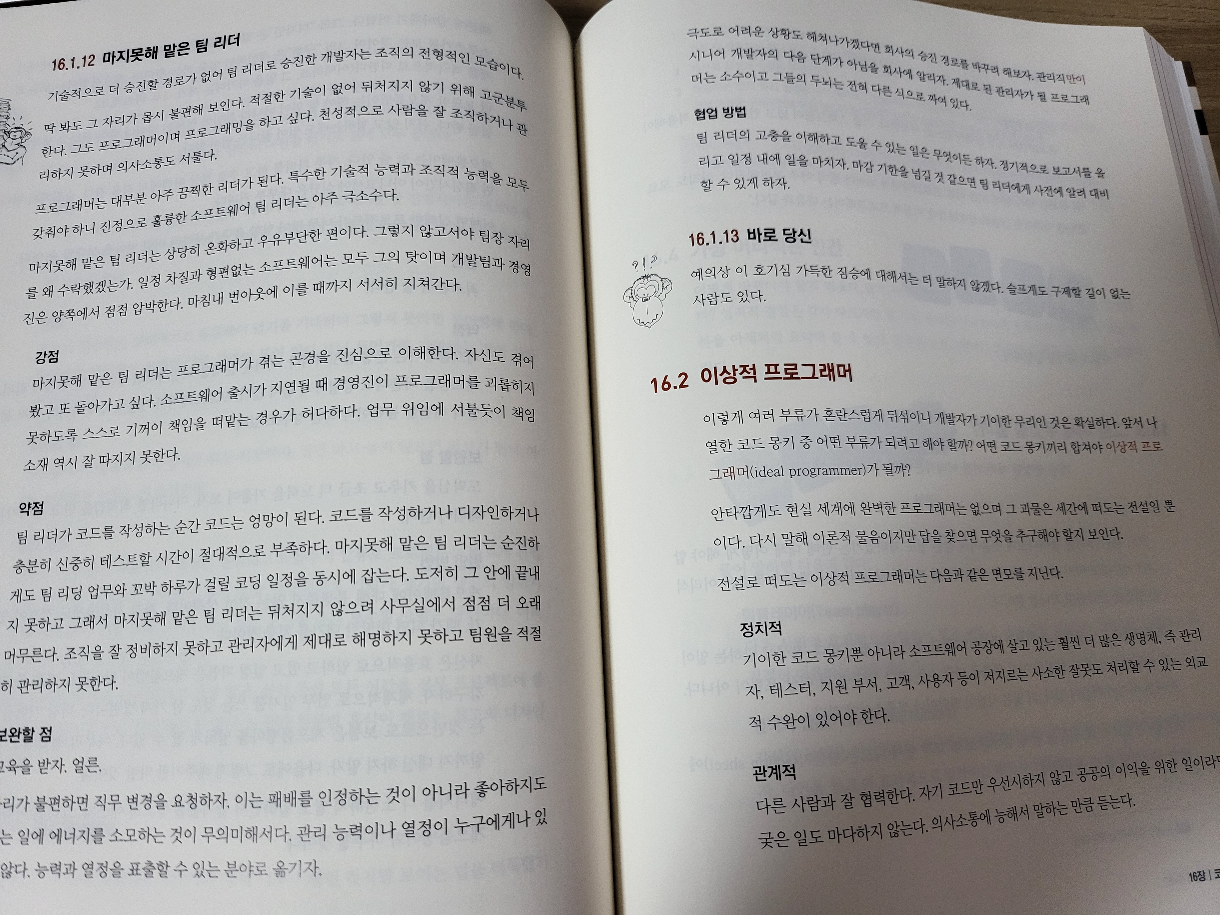 여기에서는 코드 몽키라고 개발자들에 대해 말하고 있다. 이러한 코드몽키들의 다양한 유형에 대해 말하고 있는데, 재미있는 부분이라고 생각했다. 그 코드 뿐 아니라, 코드를 만드는 사람의 특성도 잘 파악해야 결국 만드는 결과물도 좋은 영향을 받는다고 여기기 때문일 것이다.