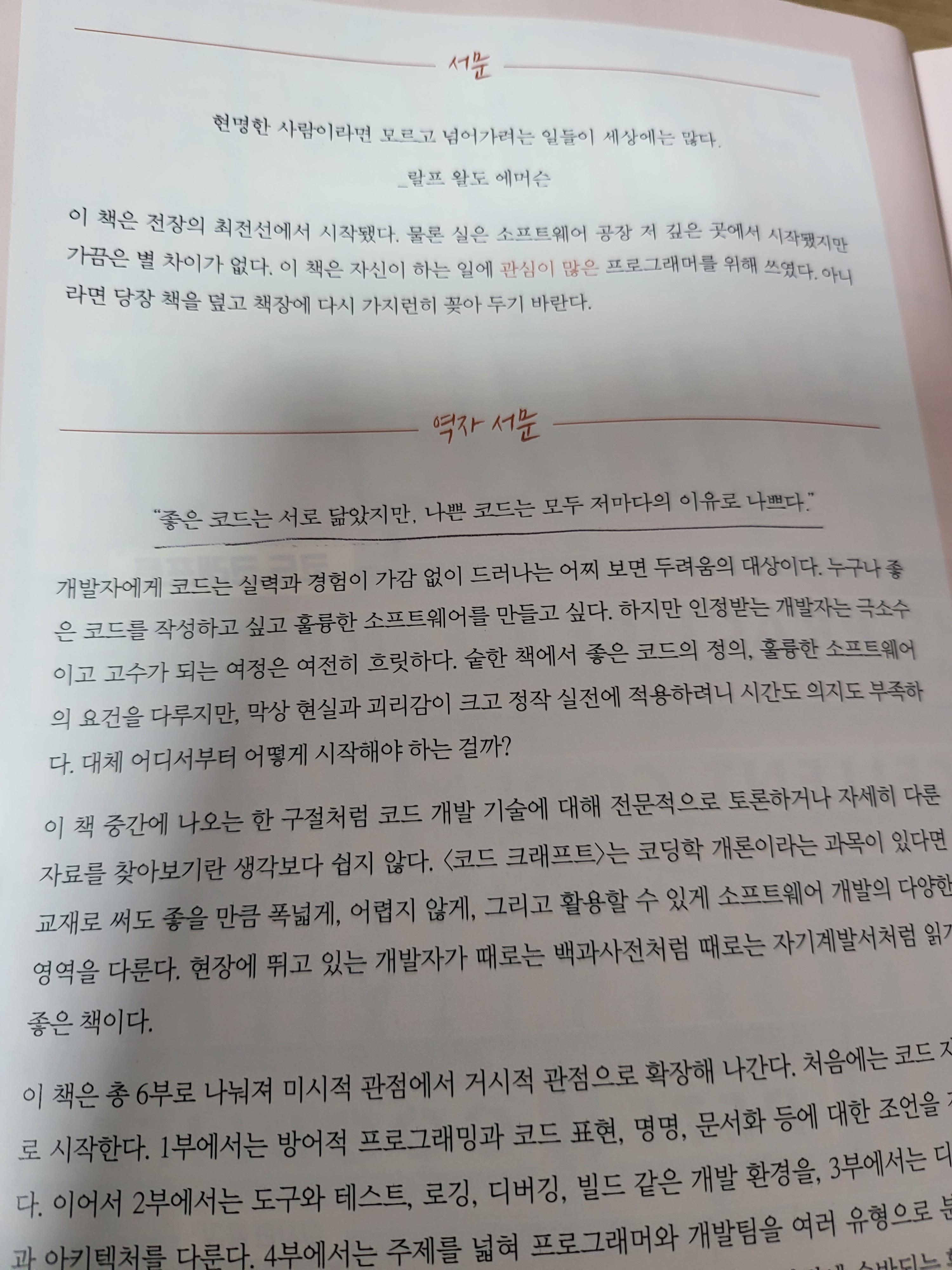 이 책은 실제 코드 자체를 다루는 느낌이 아니다. 그래서 그냥 자기계발서를 읽듯이 읽힌다. 하지만 동시에 개발이라는 분야에 대해 다양하게 다면적으로 정리한 느낌도 많이 들었다. 실제 코드를 예로 든 부분들도 많기 때문이다. 뭐랄까 한마디로 정의하기는 어렵지만 빠르게 읽기도 어렵지 않지만, 그렇다고 빠르게 읽기에는 곱씹어 보게 만드는 알짜 지식이 많이 녹아들어 있다.