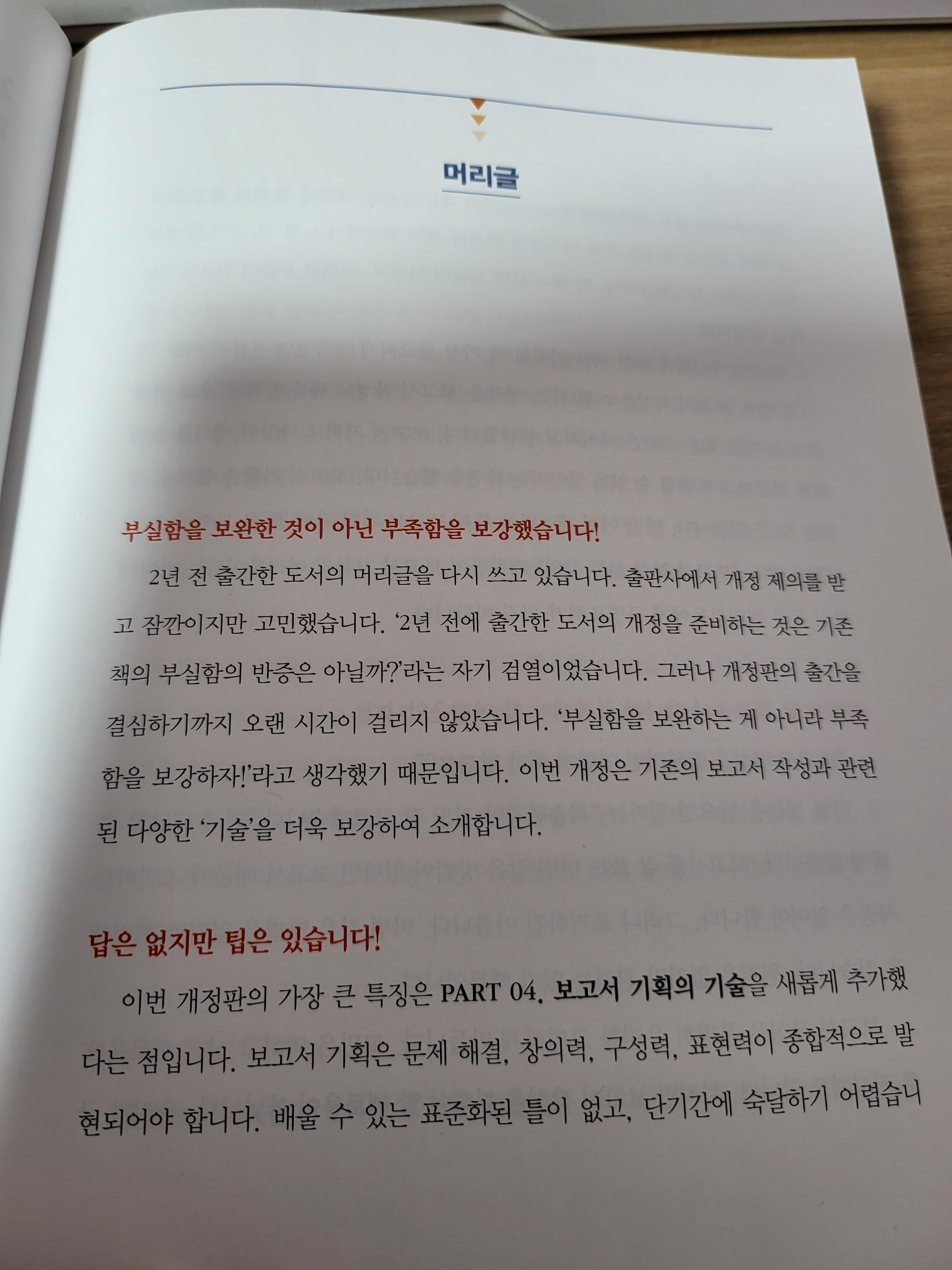 모던한 형식으로 작성된 보고서를 기대하였던 나에게 정형화된 보고서를 기준으로 기록한 이 책은 아무래도 현실과는 거리가 있어보였다. 물론 이러한 기준으로도 도움이 된다는 점은 의심할 여지가 없으나, 더 도움이 될 만한 사람들은 금융권이나 공기업, 정부기관 등에서 종사하는 사람들에 해당할 것 같은 느낌을 주었다. 폰트도 올드하게 느껴졌다. 이 책이 어떤 형식보다는 표현하는 글귀와 구성 자체에 집중하였기 때문이라는 생각은 든다.