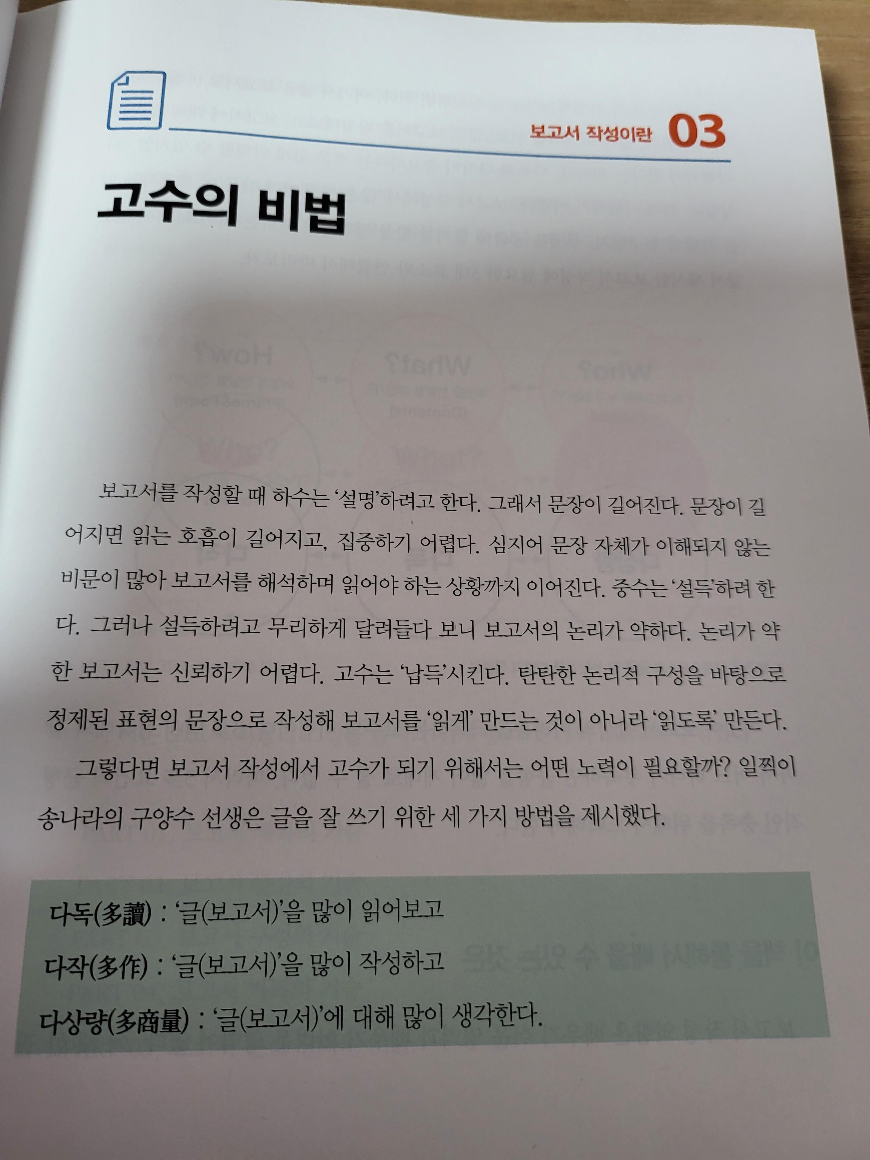 이 책의 초반에 나온 부분이지만, 사실 고수는 별개 아니다. 다독, 다작, 다상량이 중요하다는 점이다. 그러니까 이 책에서 말하는 점들을 통해 다듬어질 수 있고, 그것으로 어느정도 이상으로 끌어올리는 것은 가능하지만, 결국은 많은 관심을 갖고 행동하는 것에 기반해야 한다는 점이다. 물론 이 책에서 나온 내용으로 보완하면서 다듬어질 때에 제대로 된 보고서를 작성할 수 있게 될 것이라고 강조하기도 한다.