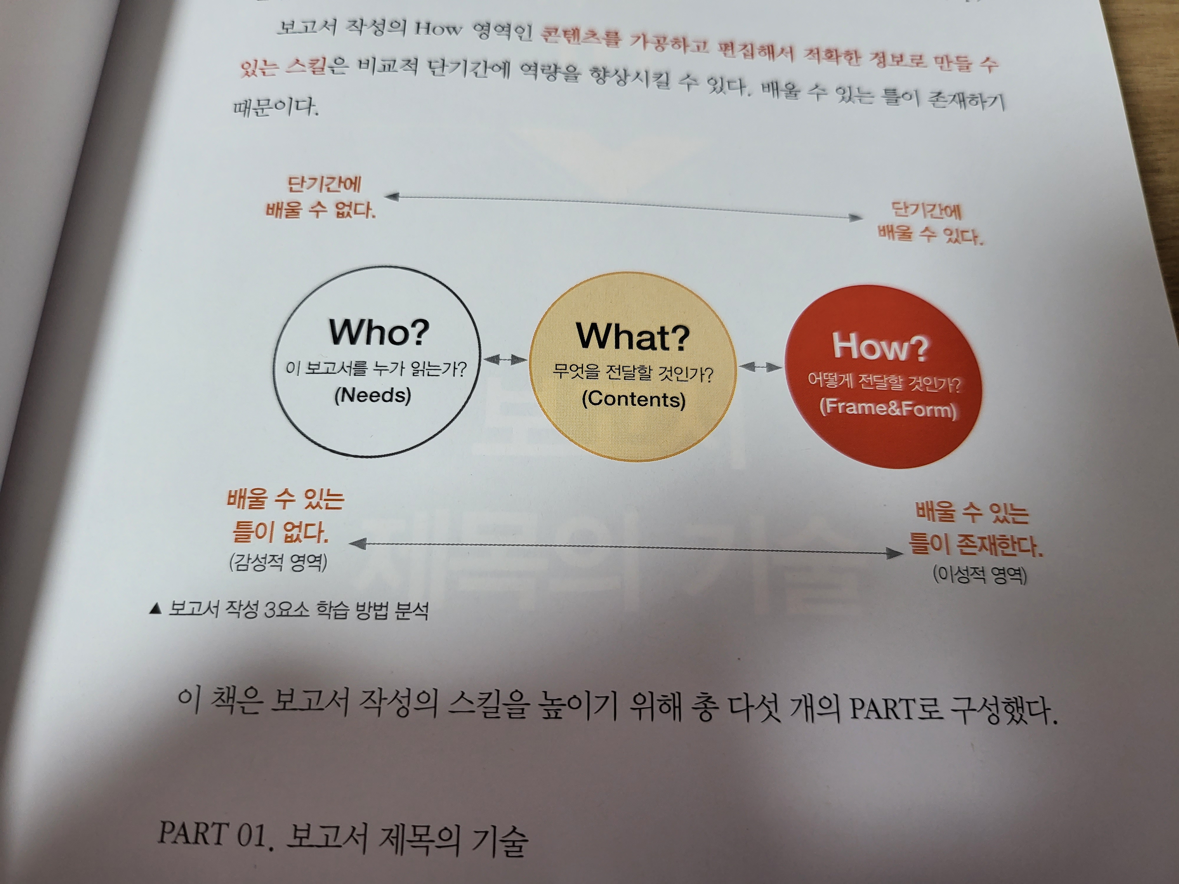 보고서에 대해 하고싶은 말이 많았을 것으로 예상되지만, 그 중에서 보고서 작성 기술인 제목, 기획, 문장구성, 논리강화 등에 대한 부분을 중점적으로 다뤘다. 사실 다독, 다작, 다상량을 하기에는 시간이 필요한 것이 사실이지만, 그것에 필요한 기술을 습득하는 노하우를 전수해주듯이 기술을 기록하였다. 각 신경쓸만한 작성 기술을 익혀놓은 상태에서 작성한다면 충분히 가치있는 보고서가 될 수 있도록 안내하고 있다.