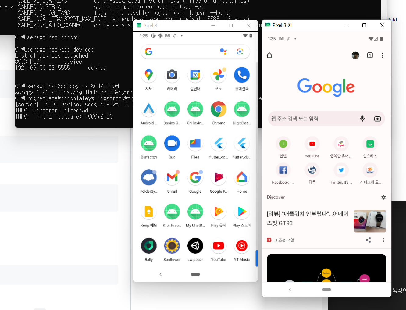 이것을 활용하면 아래의 캡처 화면처럼 실제 두 대의 기기를 동시에 미러링 및 컨트롤 하는 것도 가능하다. 실로 다양한 환경에서 개발을 진행하는 개발자에게는 매우 유용한 부분이다.