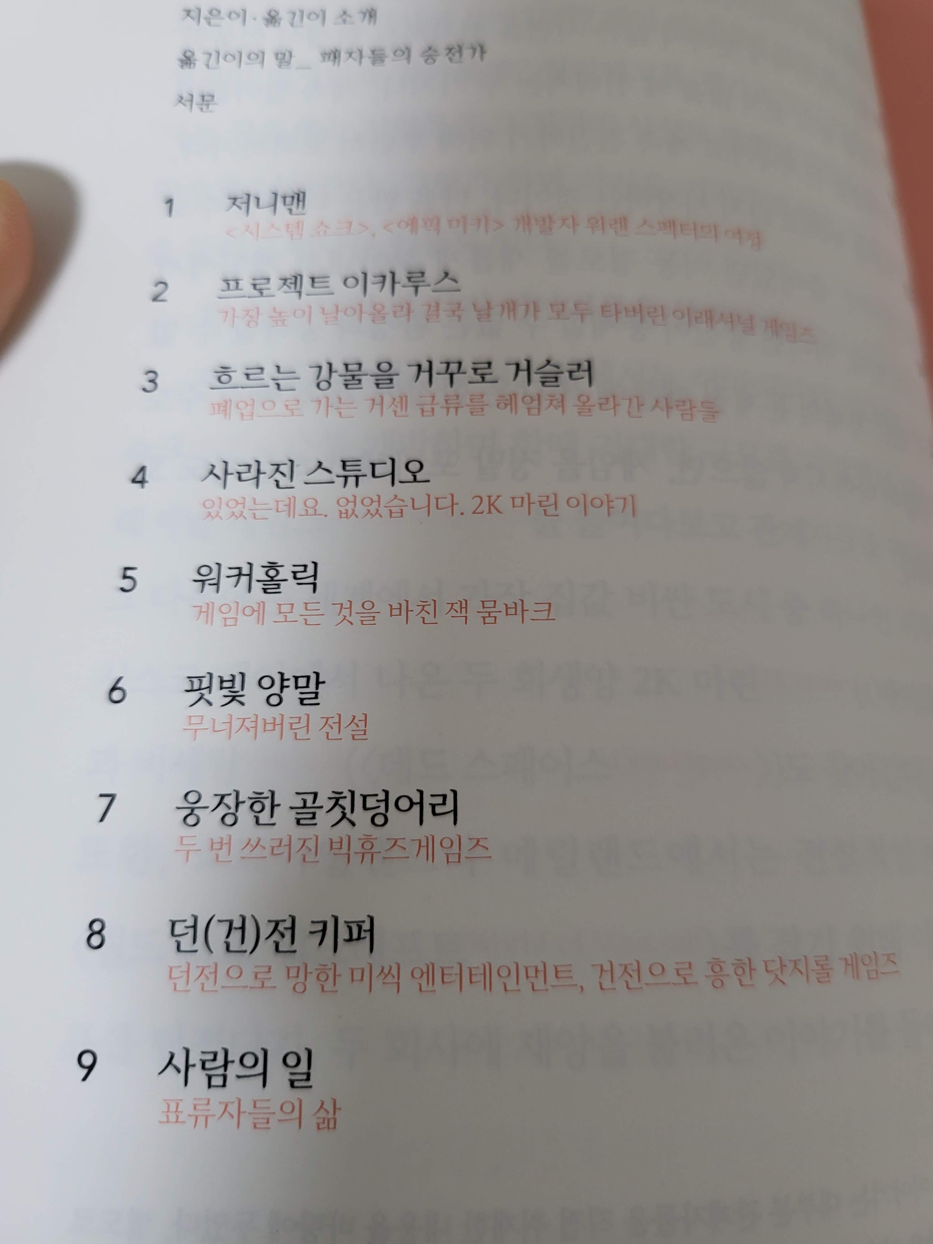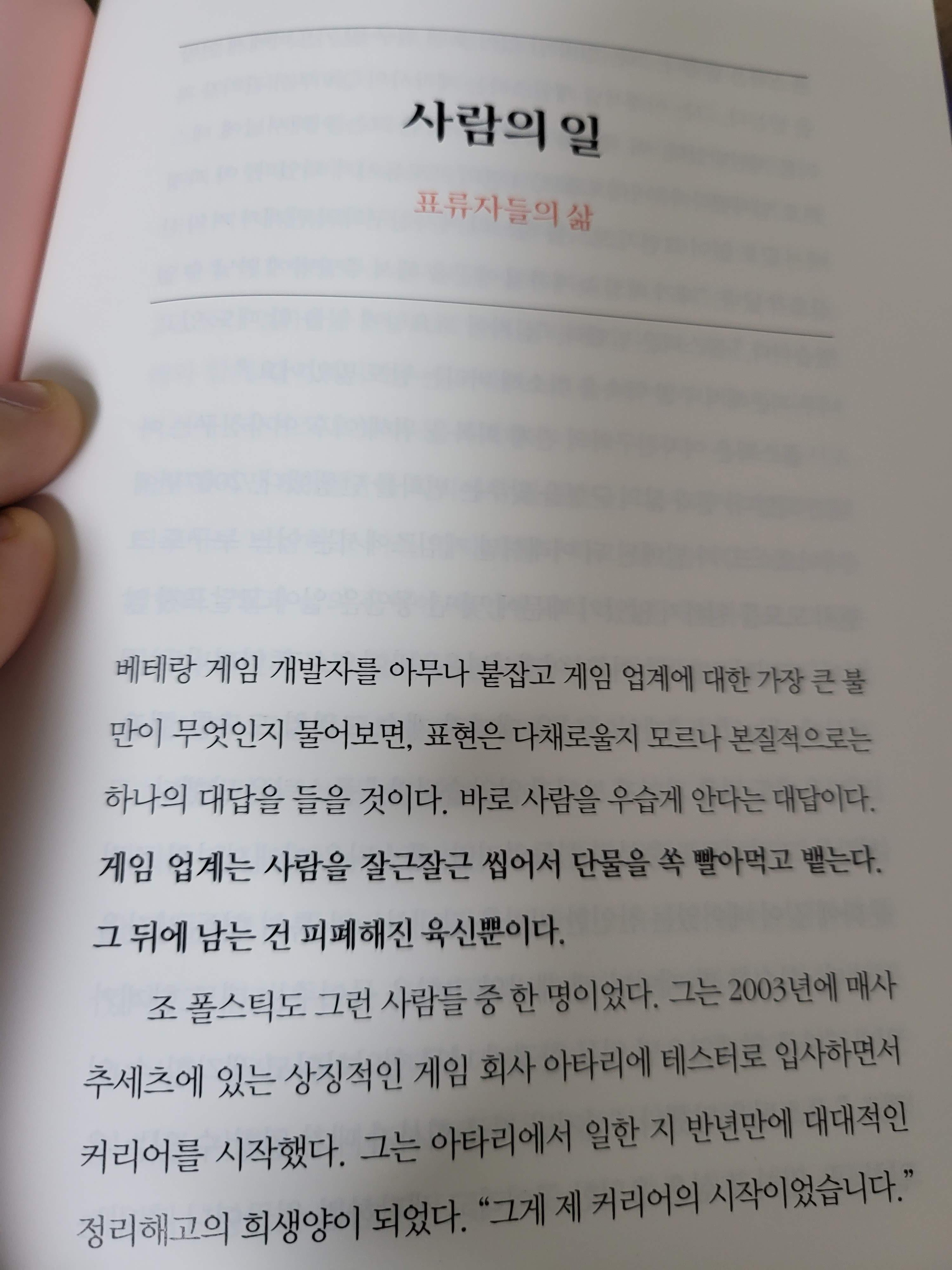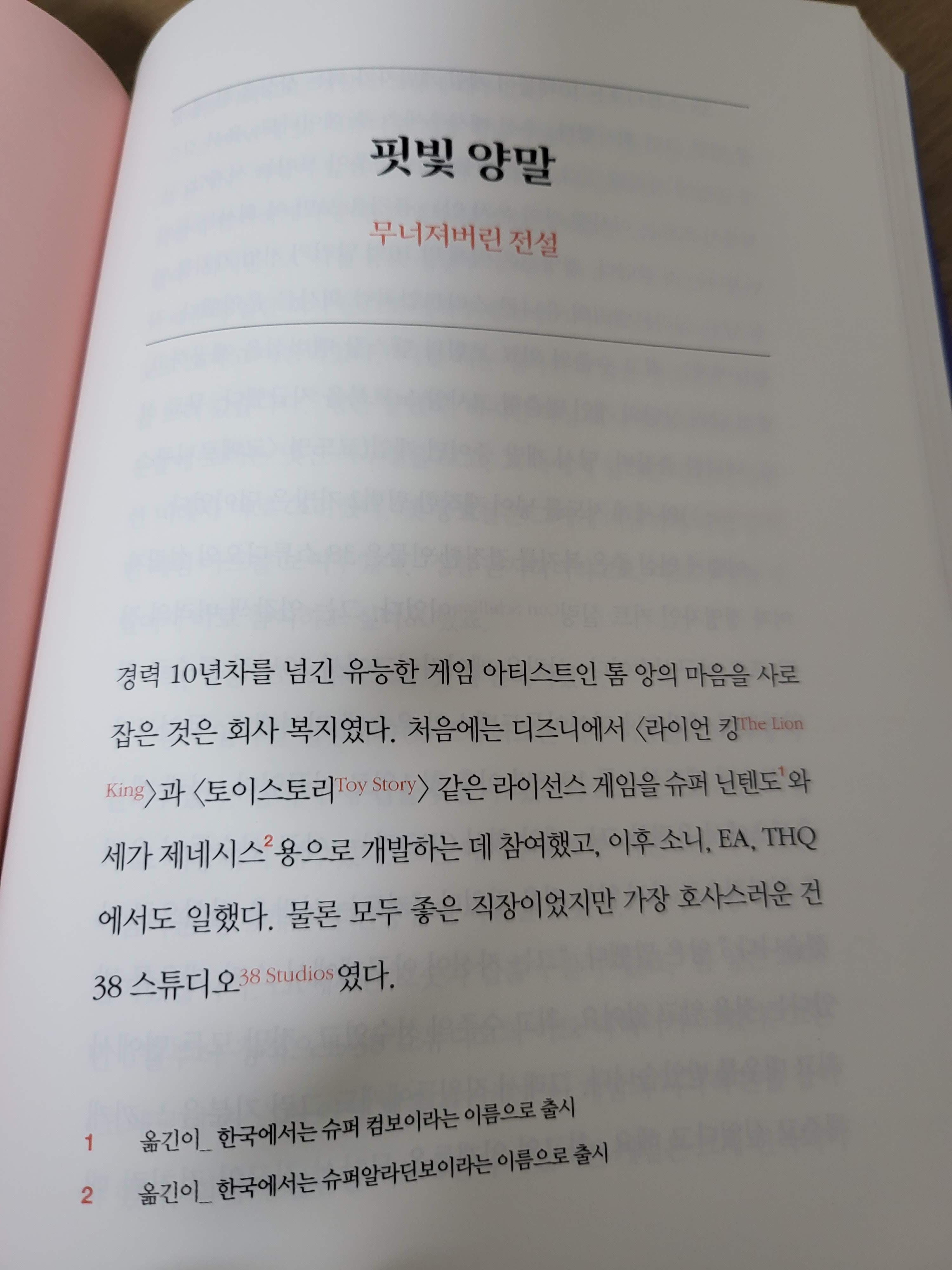이 책의 성격을 서문에서 말하고 있다. 여러가지 특징을 말하는 것 중에 인상적인 부분인데, '이 책은 게임 제작사가 망했을 때 생기는 일을 이야기 한다'는 점이다. 보통은 대놓고 말을 하든 그렇지 않든 성공담에 대해 말한다. 이렇게 해서 누군가는 성공을 했다. 그러니 당신도 성공을 하고싶다면 이 이야기를 참고하라는 뜻으로 많은 이야기를 기록하는 편이다.
