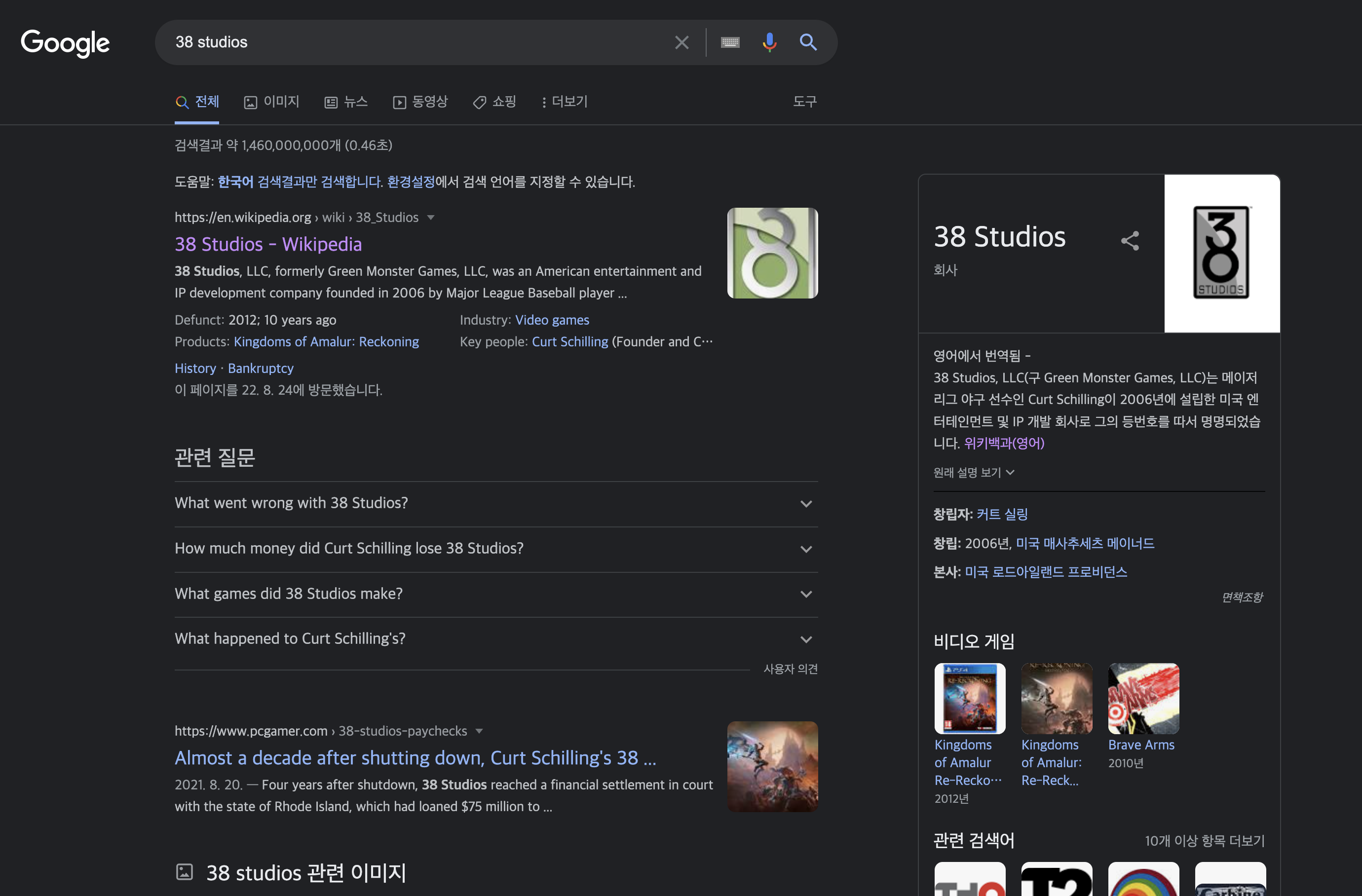 분명 옛날 회사에 대한 이야기인데, 실존하는 현재 회사의 이야기 처럼 매력적인 회사의 이미지를 묘사하였다. 최고수준의 의료보험과 헬스장 멤버쉽고, 개인 맞춤형 고사양 노트북과 넉넉한 출장비와 무료식사 등.. 이런 내용은 현재 잘나가는 판교의 IT 회사들에 대입해봐도 크게 다르지 않는 느낌이다. 그만큼 매력적인 스튜디오이다. 그래서 궁금했다. 38 studio가 어떤 곳인지. 그런데 충격적이게도 현존하는 것은 아무것도 남아있지 않았다. 그저 위키피디아에 문서로만 남아있을 뿐.(한글 검색으로 38 스튜디오라고 하면 위키피디아도 없이 아예 다른 결과가 나와버린다.)