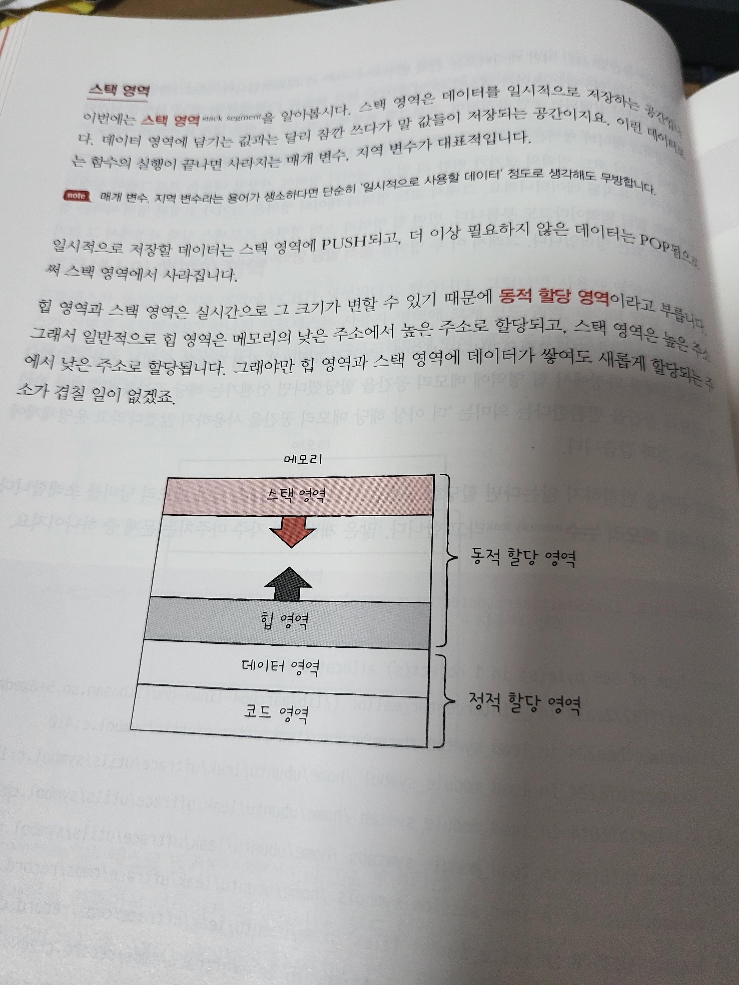 이 책의 많은 부분을 실을 수는 없기에 보이는 대표적인 부분을 하나 담아보았다. 프로세스가 메모리에 적재되어 코드가 실행될 때, 각 영역이 어떤 구조로 존재하는지 간단히 그림을 그려놓았다.