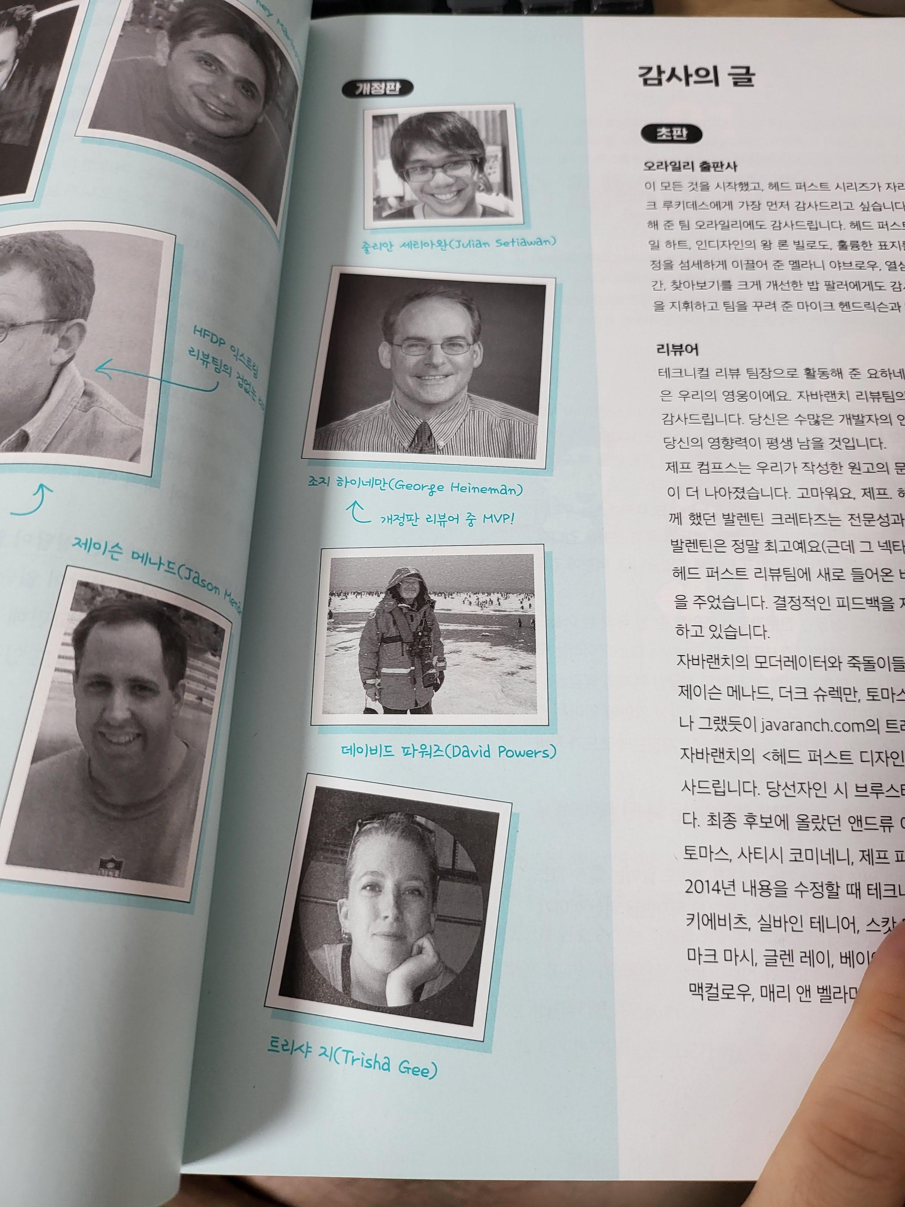 많은 책이 그렇지만, 이 책은 특히나 집필하는 데 도움을 준 사람이 많은 것 같다. 그리고 개정판 역시 그것의 연장선에 있었다. 일단 기존의 테크니컬 리뷰어를 모두 수록해주었으며(이 분들의 현재 모습은 17년 더 세월을 맞으셨겠지..), 추가로 개정판에서 도움을 주신 분들을 기록하였다. 이 책의 퀄리티를 올리는데 기여한 분들을 이렇게 사진으로 기록하는 것은 헤드퍼스트만의 특징으로 기억된다.