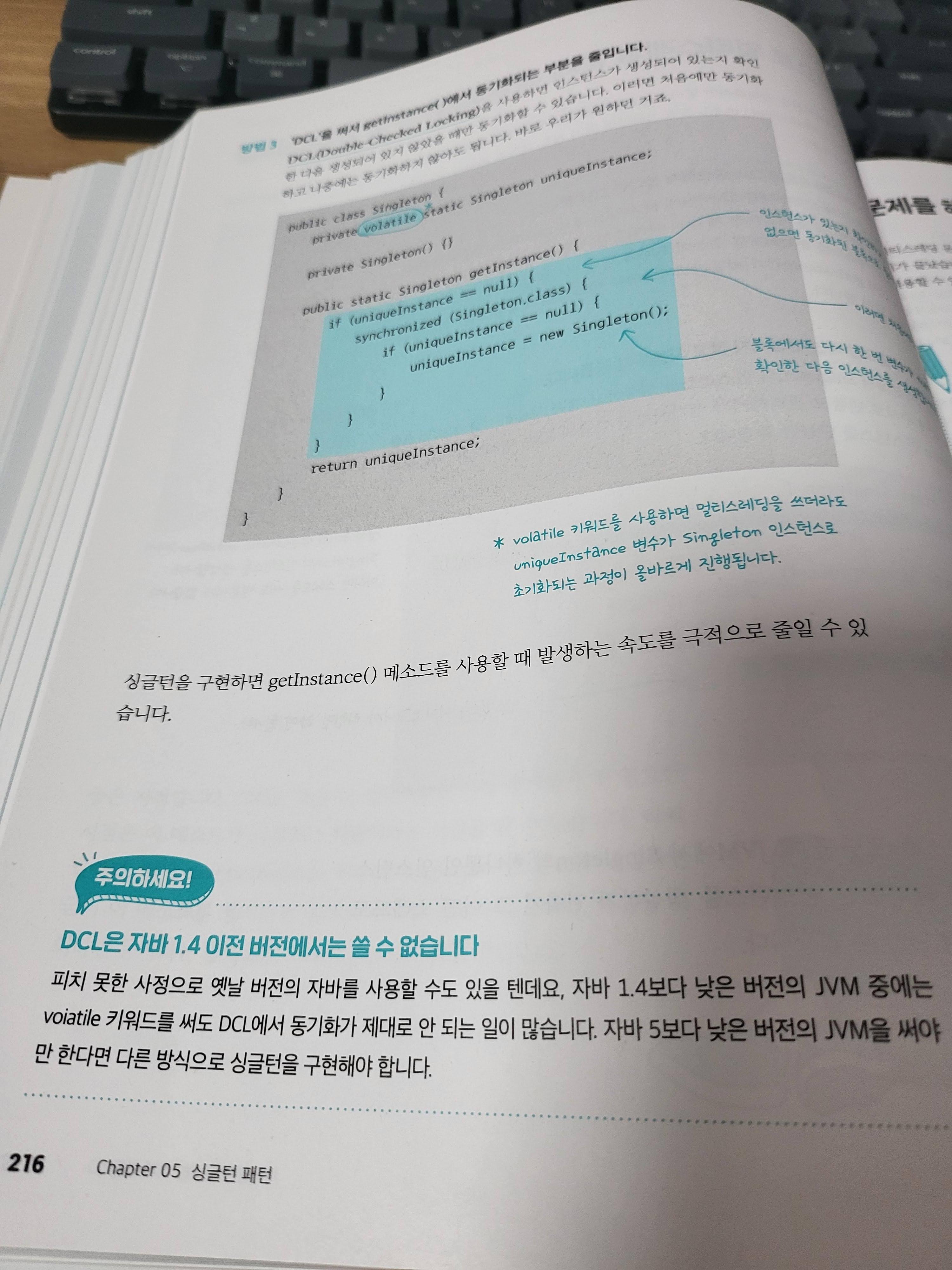 싱글턴 패턴에 대한 설명인데, 여기에서 모두들 알만한 DCL(Double-Checked Locking)을 너무 올드한 자바 버전에서는 사용하지 못한다고 이야기 하고 있다. 하지만 현재 어디에서도 1.4를 사용하는 환경을 찾기는 매우 어렵다. 최소한 보안적인 이슈 때문에서라도 1.4 버전을 사용했더라도 최소 1.6 이상으로 올렸을 것이기 때문이다. 그렇기 때문에 저 설명 자체는 굳이 이 개정판 시점에 필요했을까 싶은 생각이 들었다. 오히려 자바 11이상에서는 어떤 방법으로 좀 더 효율적으로 사용할 수 있는지 등에 대해서 나오면 어떨까 생각도 해 보았다.
