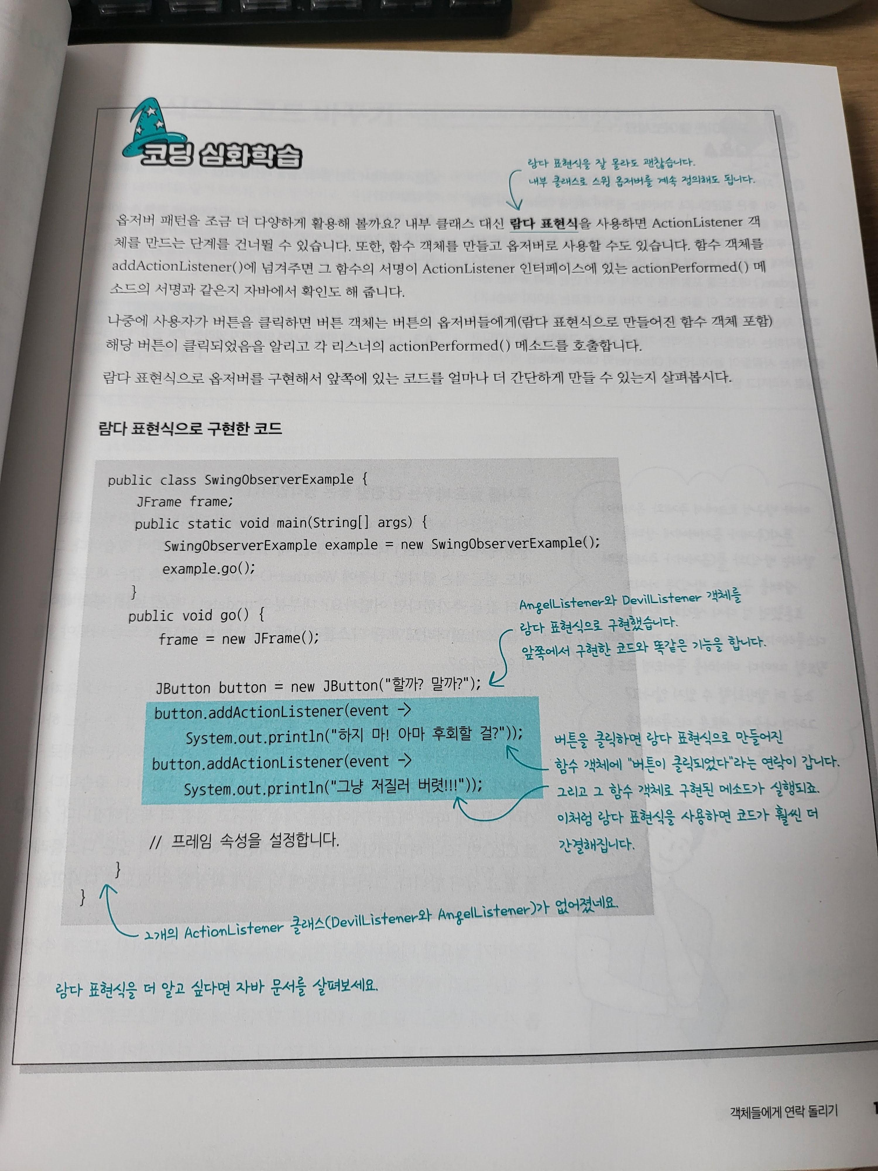 이 책에서 중요시 여기는 부분은 아니기에 상관없다는 생각도 들지만, 자바의 버전에 따라 언급을 제외한 부분도 있어서 언급하고 싶다. Observable 클래스를 제외한 부분이 바로 그런 부분이며, Lambda를 추가한 부분도 해당이 된다. 이렇듯 Lambda를 조금 더 적극적으로, Stream과 같은 함수를 통해 개선한다면 어땠을까 싶다. 또한 MVC에 대해 언급한 복합패턴 부분에서는 MVVM과 같은 부분도 일정 지면을 할애 했다면 좋았을 것 같다.