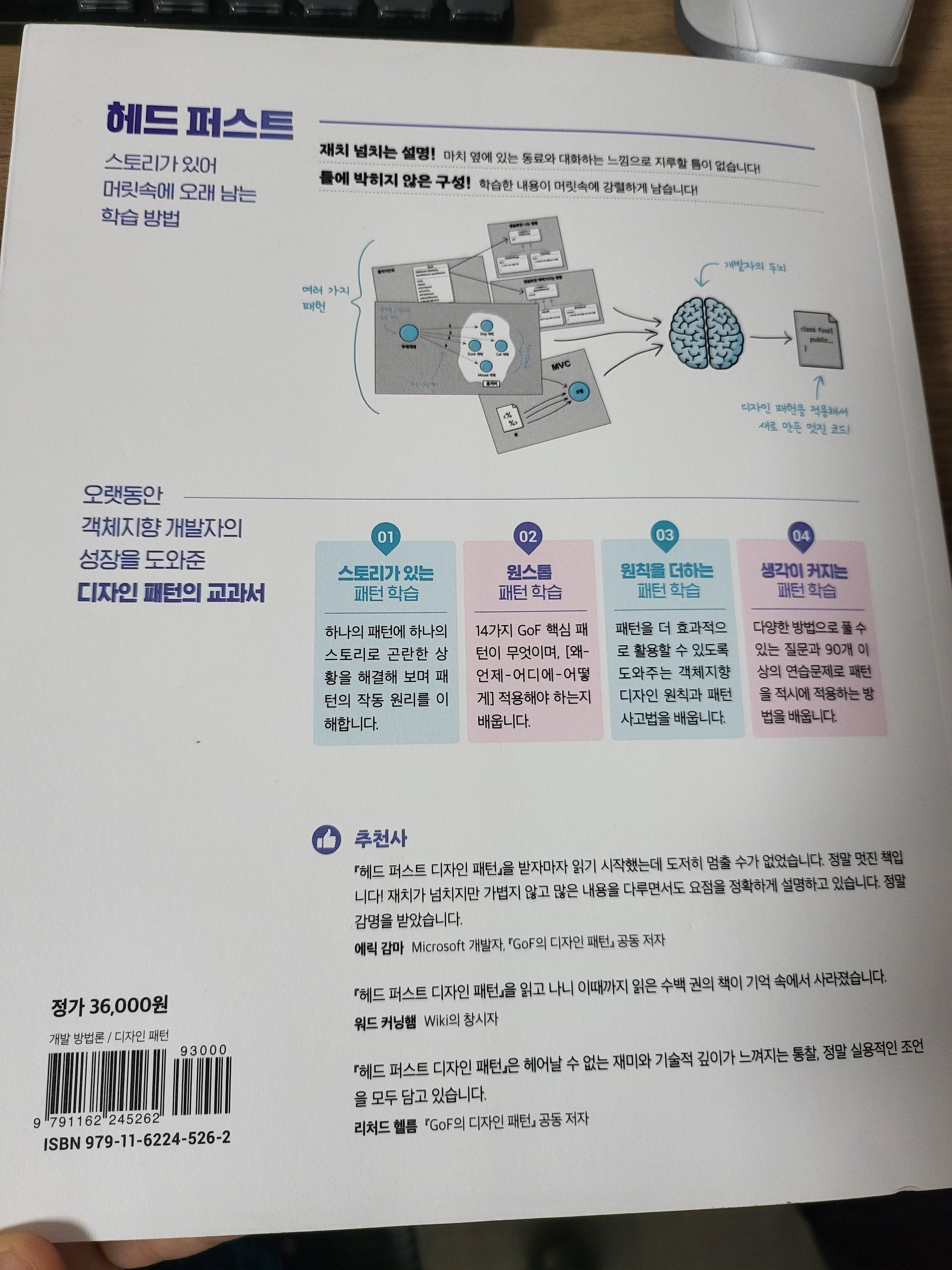 이 책의 뒷표지인데, 깔끔해서 마음에 들었다. GoF의 공동저자가 추천사를 적어준 책이라는 점에서 인상적이었다. 그 뿐 아니라, 14가지 GoF의 핵심 패턴을 다루었으며, 재치넘치는 설명, 틀에 박히지 않은 구성 모두 이 책에 대한 요약을 제대로 나타내었다는 생각이 든다.