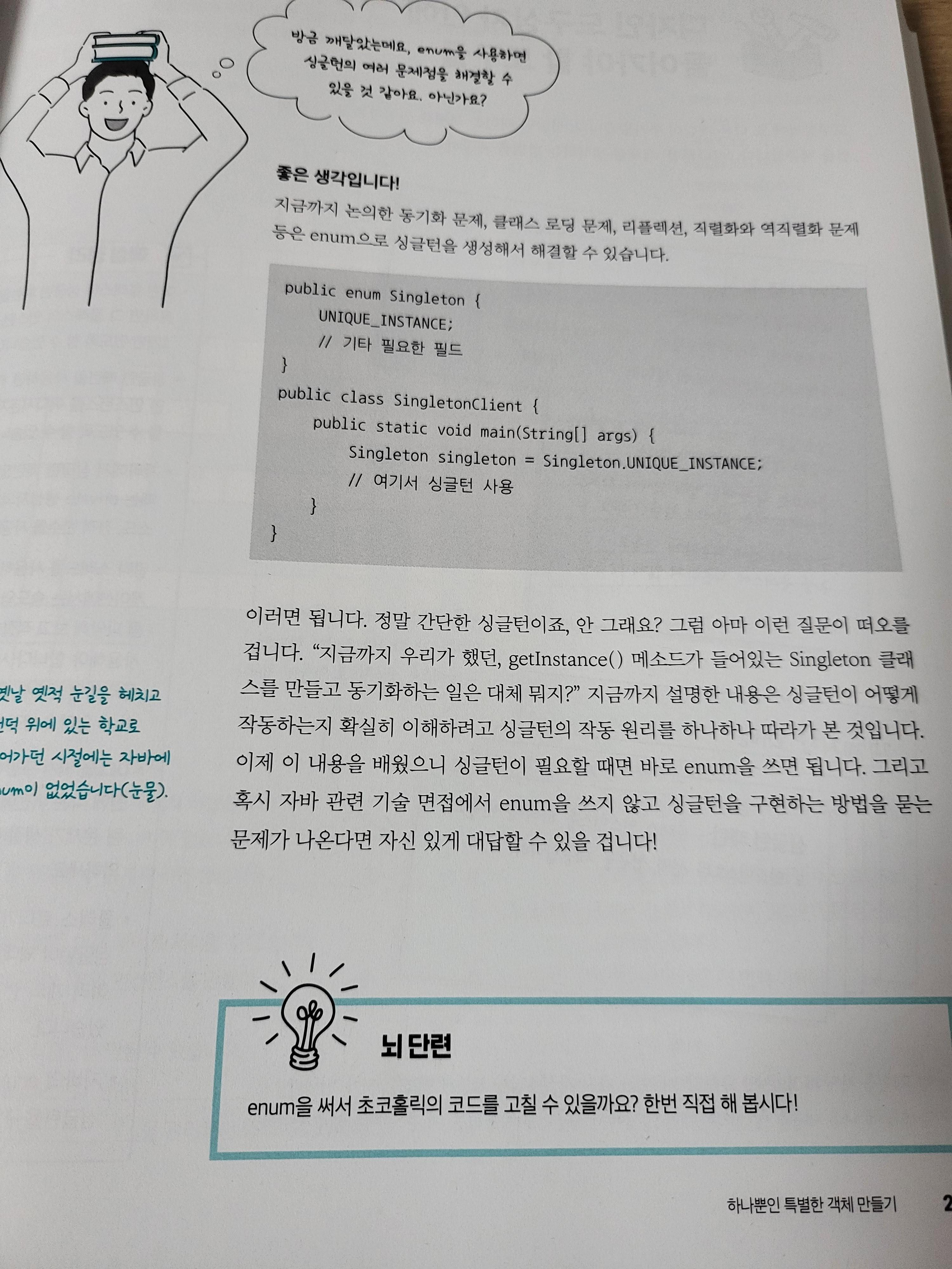 enum을 이용하여 싱글턴을 구현할 수 있다고 이야기 한다. 물론 기술면접용으로 싱글턴 구현 방법을 알아야 한다고 하지만, enum으로 구현이 가능하다니 그건 이 책을 지금 읽으면서 알게 된 사실이었다. 다만 어떤 효과로 이것이 가능한지 구체적으로 나와 있지는 않기에 틈내어 추가 연구를 하여, 추후 포스팅을 하면 어떨까 생각을 해 보았다.