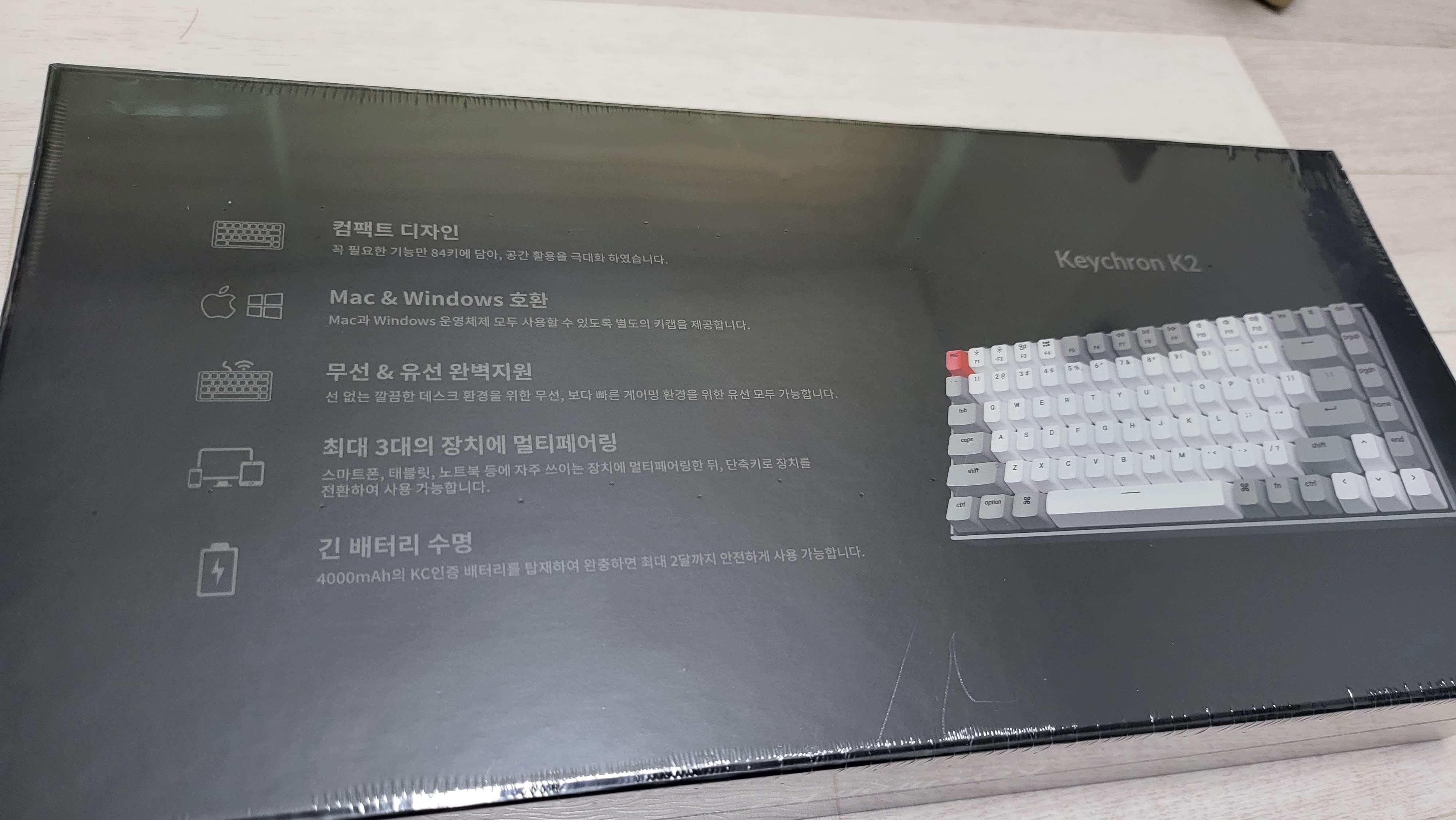 일단 키보드의 상자이다. 키보드 상자는 그렇게 크다고 느끼지는 않았다. 사람의 손마다 다르겠지만, 내 손의 기준으로 두 뼘이 채 안되는 가로사이즈와 한 뼘이 채 안되는 세로 사이즈를 가진 크기였다. 이전의 많은 키보드는 키보드의 사이즈에 비해 상대적으로 상자는 컸었으나 이것은 컴팩트한 느낌이었다. 이 상자보다 살짝 작은 크기의 키보드였기 때문이다.