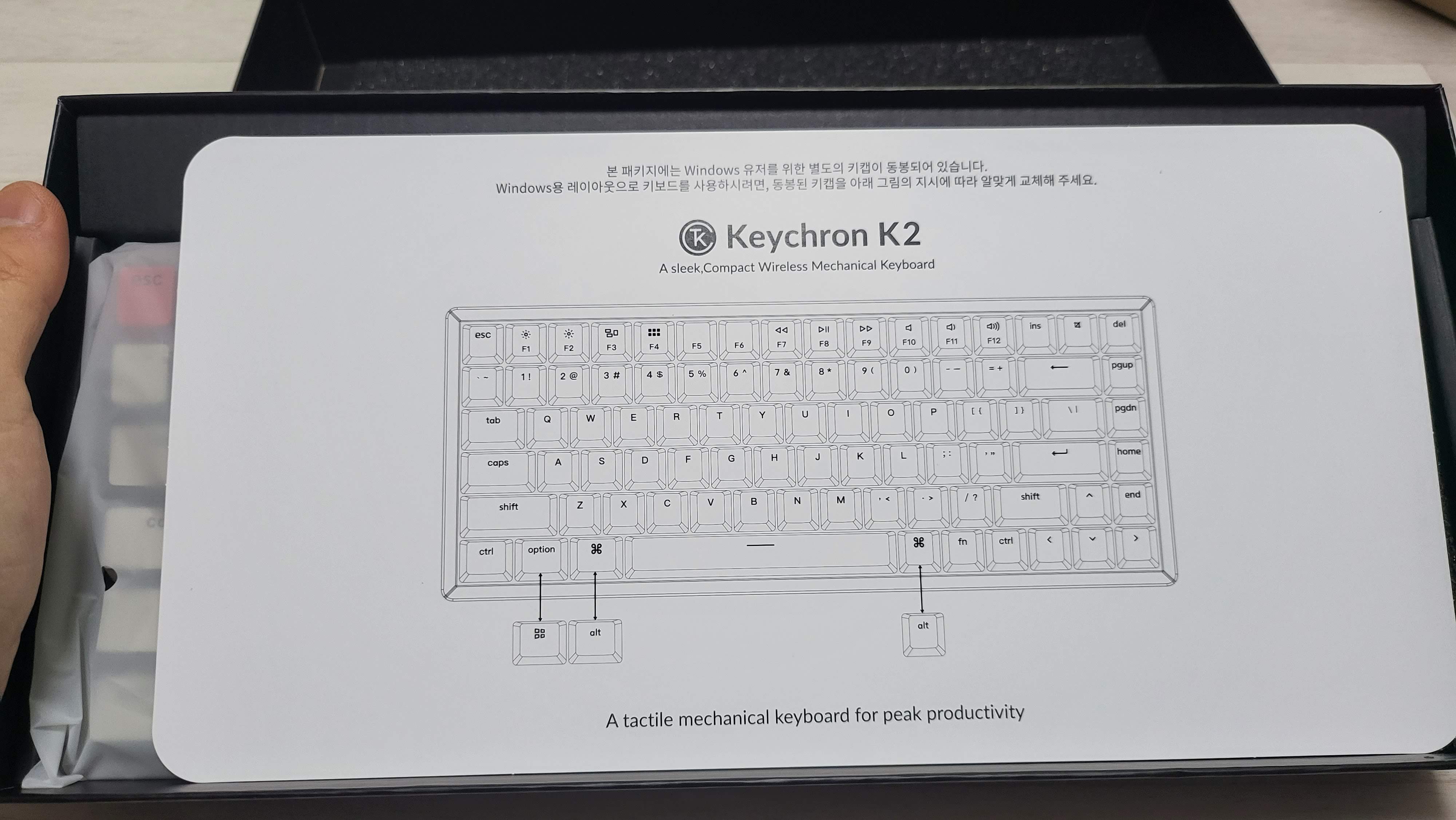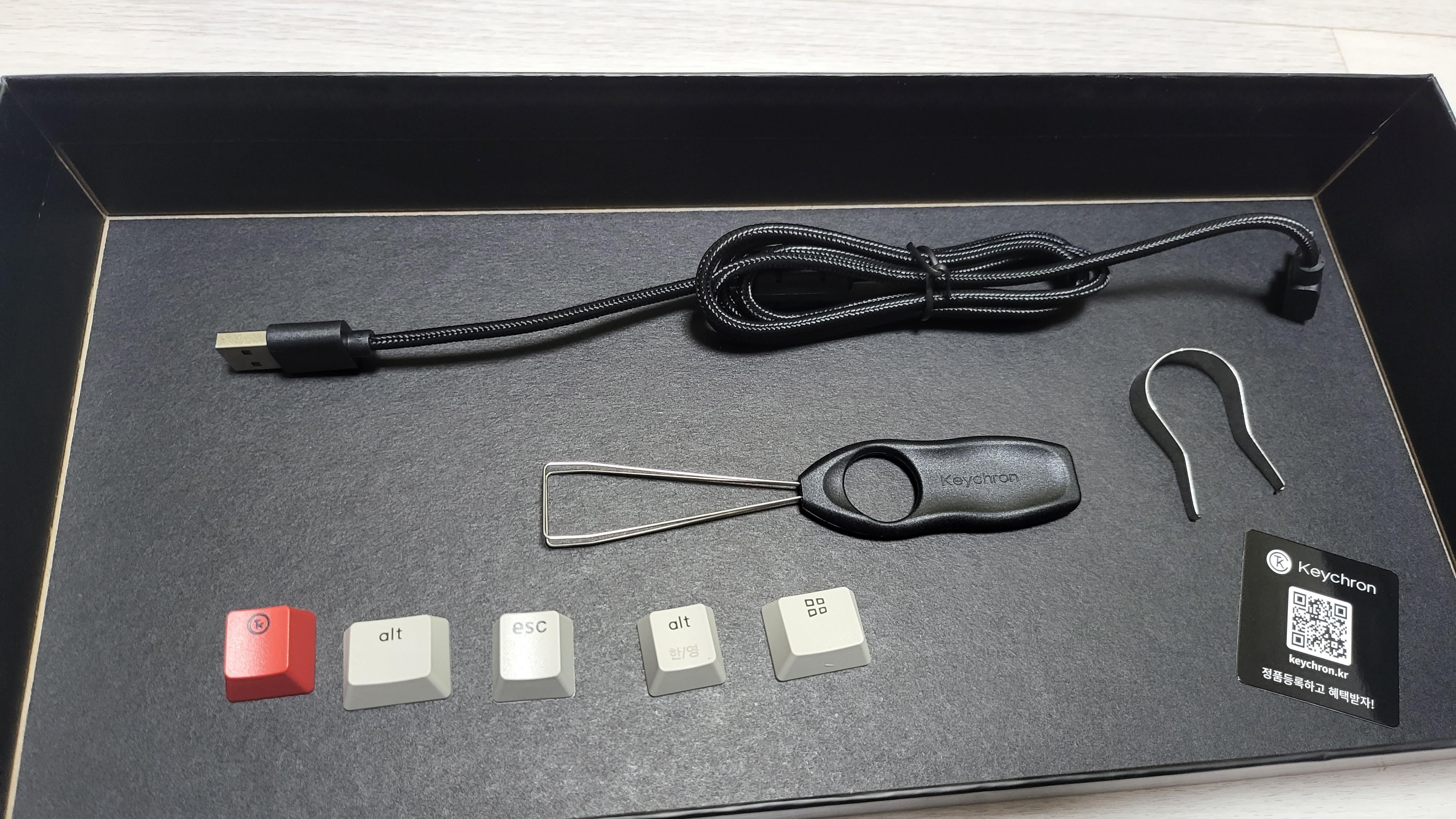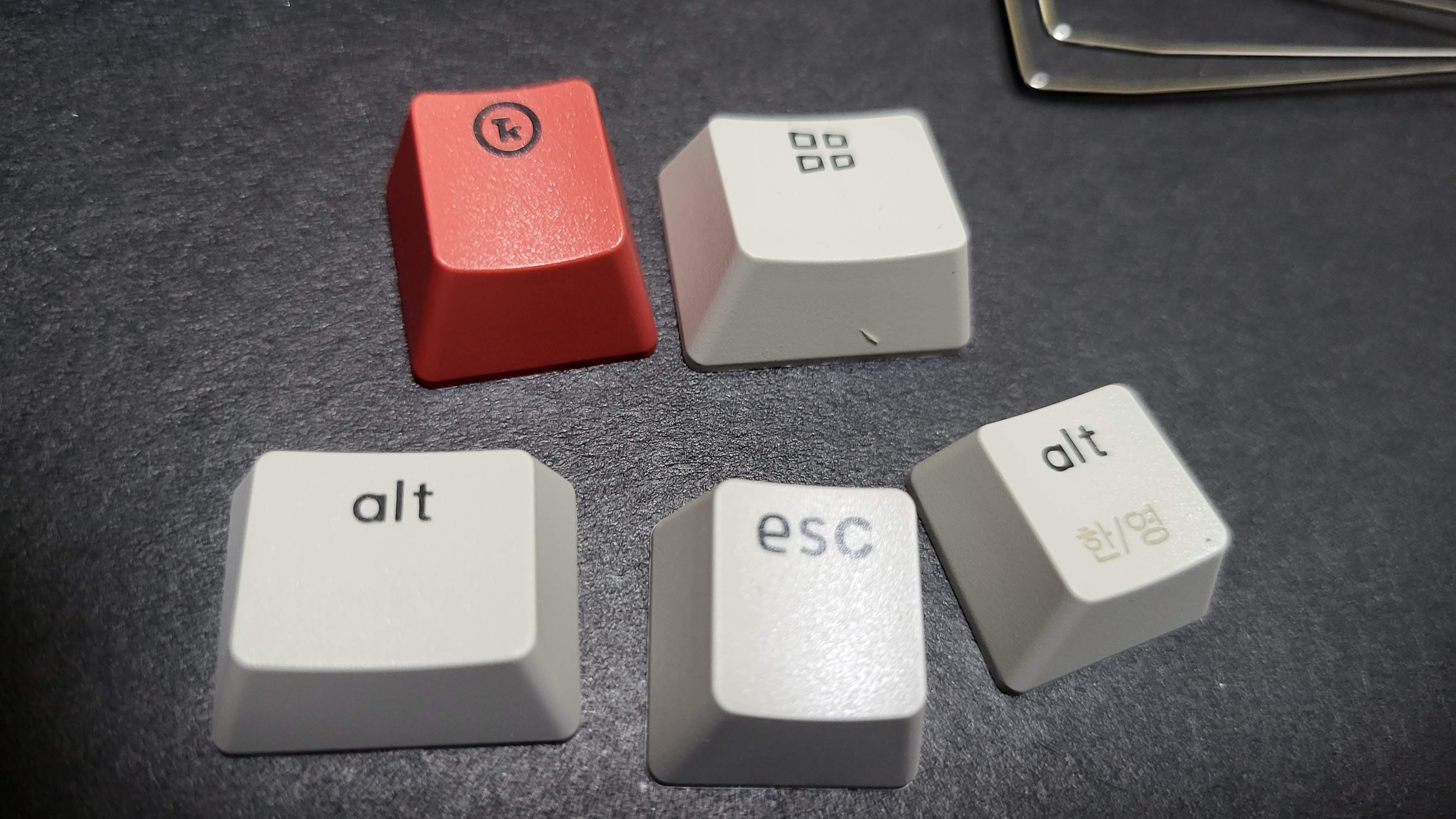 키캡이 윈도우 키캡으로 되어있으며, 빨간색 키캡은 특수키에 사용하라는 것인지 의미는 알 수 없었다. ESC와 키캡 색이 동일한 것으로 보아 해당 위치의 키를 바꿔서 장착하라는 뜻으로 보이는데 알 수는 없었다.