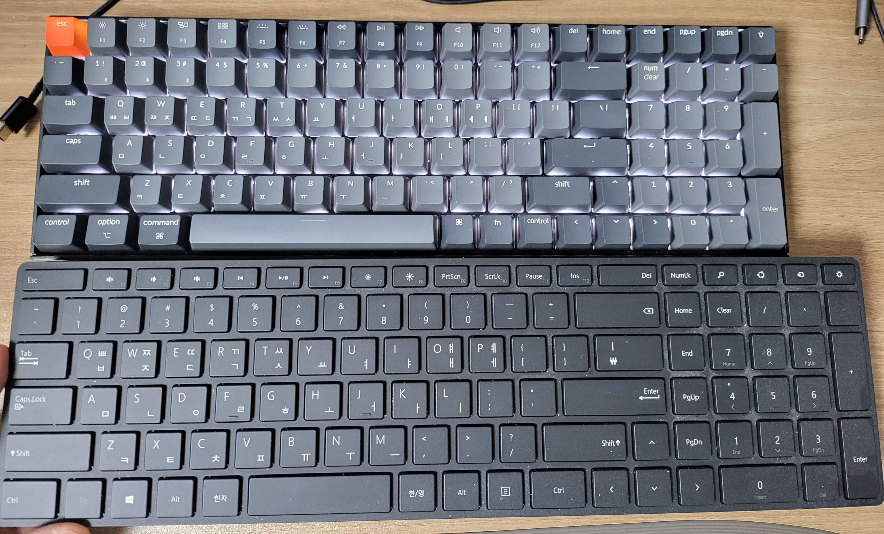 가지고 있는 키보드 중 풀배열 키보드가 많지 않았는데, 다행히 하나 가지고 있던 것이 생각나서 이것으로 비교하였다. 확실히 여유가 눈에 보인다. 키크론 K4는 빈틈이 없이 배열되었기 때문일 것이다. insert키를 비롯하여 일부의 키만 없지만, 키보다는 빈틈이 없기 때문에 차이가 큰 것 같다.