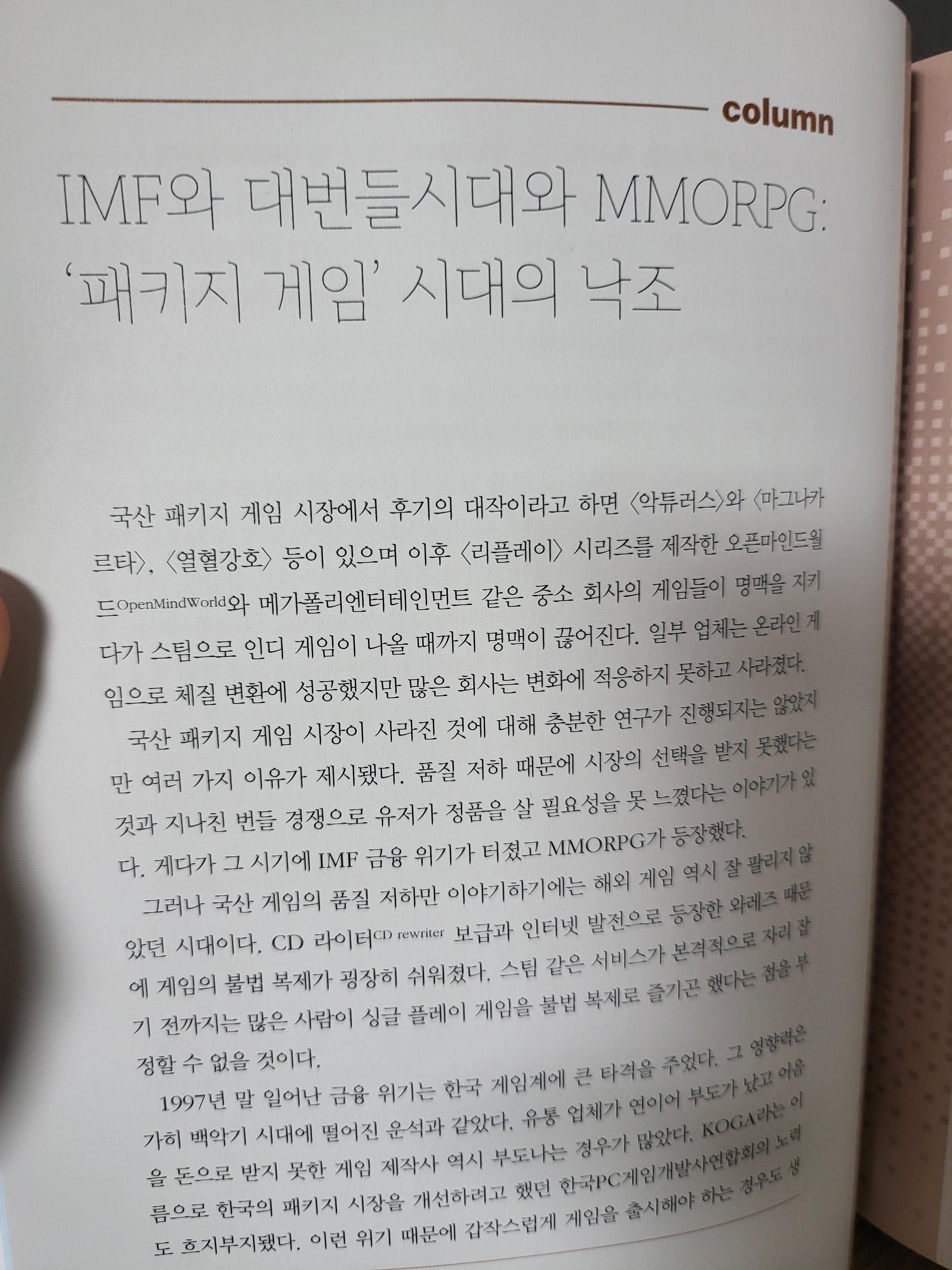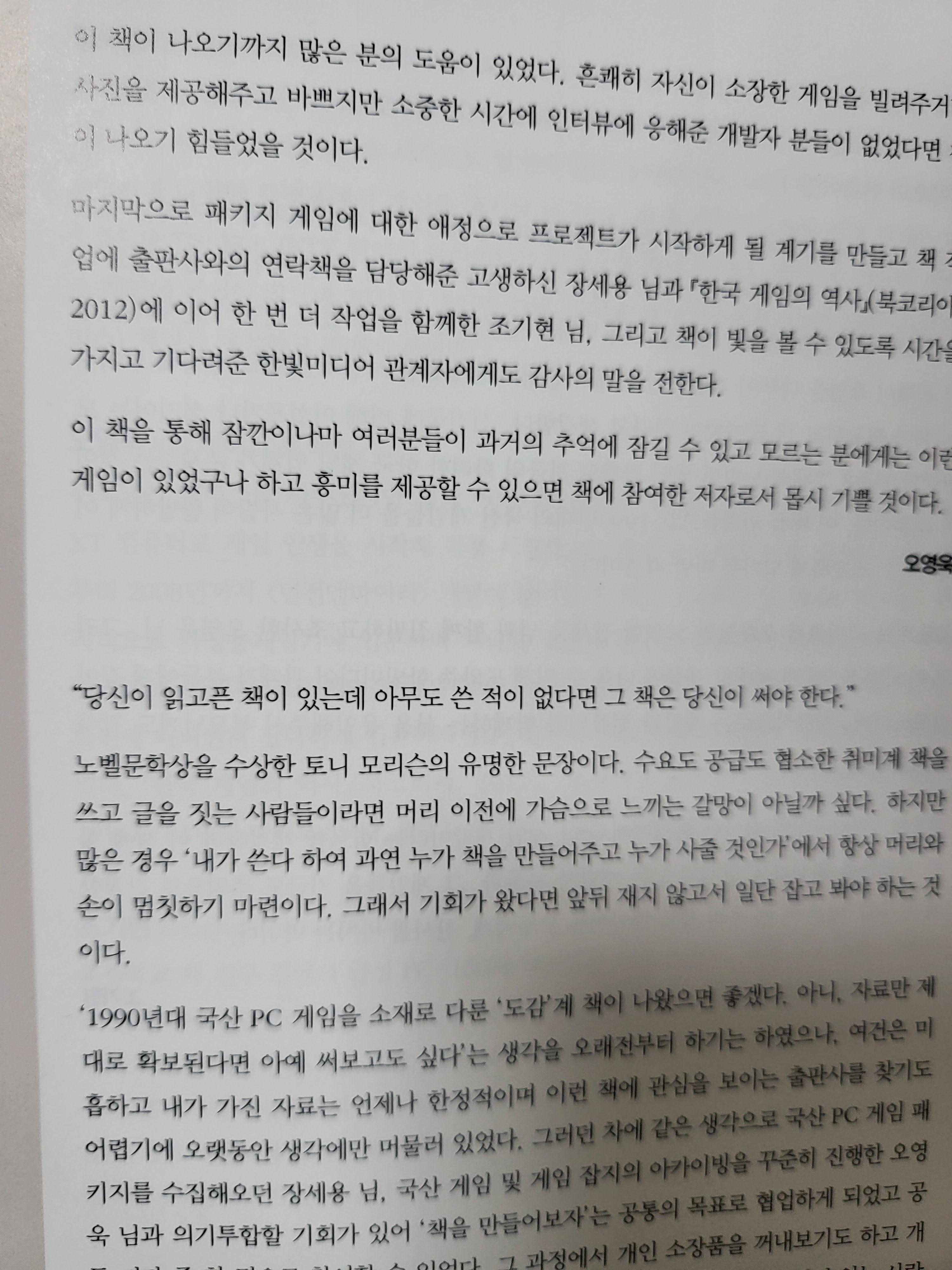 한국 게임의 역사를 이 책 한권으로 다 볼 수는 없겠지만, 최소한 굵직한 게임의 목록을 볼 수 있다는 것만으로도 설렜다.