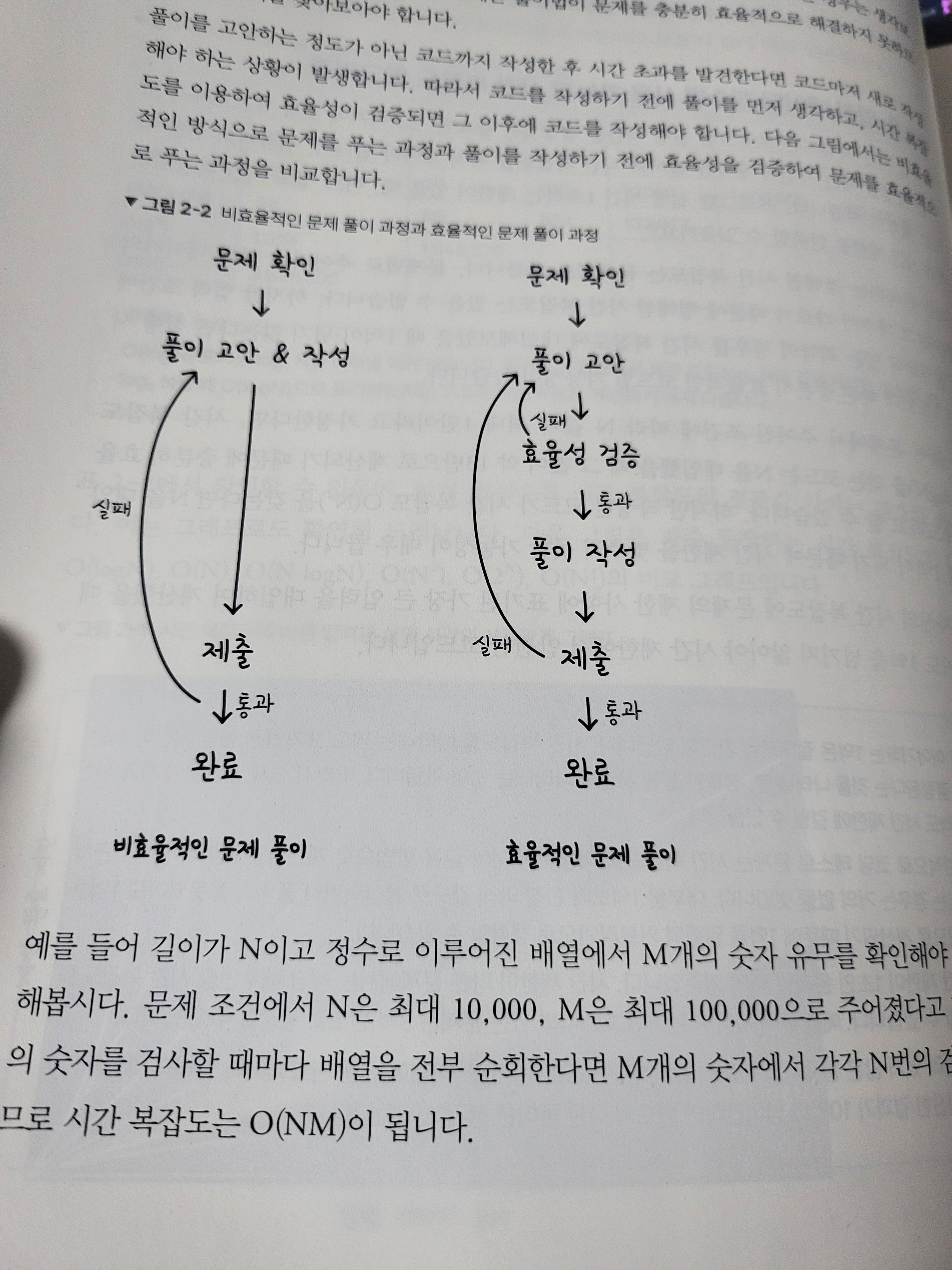 문제 풀이를 할 경우 큰 맥략에서 풀이흐름을 먼저 고민한 뒹, 효율성을 검증하고, 그 다음에 풀이를 작성한 다음 제출을 시도해보는 것을 권하고 있다. 이러한 코딩테스트에서 시간복잡도는 생각보다 큰 비중을 차지하고 있으며, 시간복잡도에서 해결이 되지 않을 경우 전체적인 풀이를 변경해야 하는 상황이 발생할지도 모르기 때문이다. 우리가 실전 개발시 효율성을 생각하여 개발하되, 그것을 함수나 모듈 단위로 개발하는 것처럼 이것 역시 그러해야 함을 알려주고 있다.