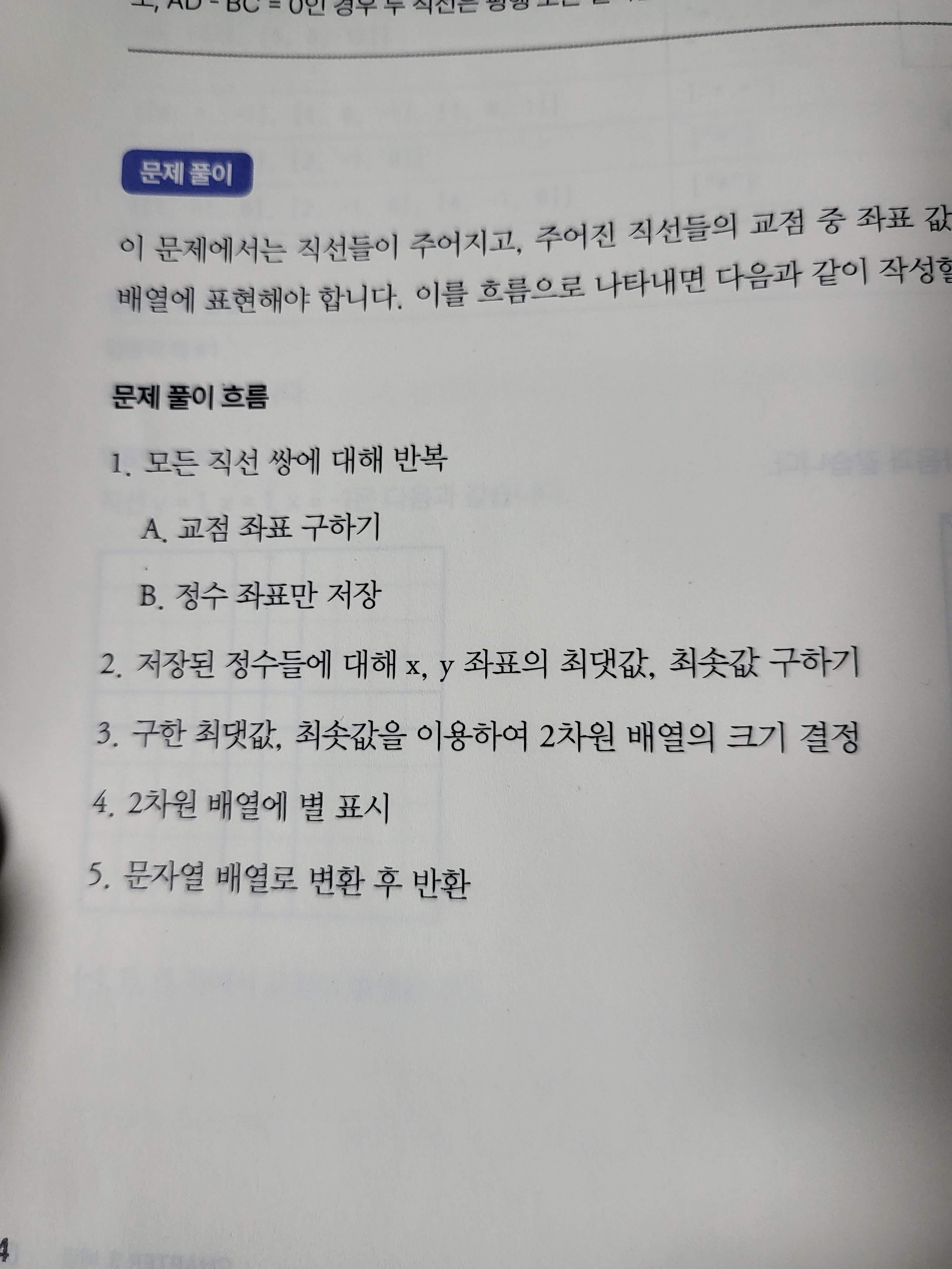 이 책은 여러 예제 문제를 같이 풀어보는 방식으로 되어 있다. 각 문제에서 실제 코드를 작성하기 전, 이렇게 문제풀이 흐름을 작성하고 시작하게 되는데, 이것은 내가 기존에 해오던 방식과 유사하여 눈에 띄었다. 이것을 나의 경우에서는 주석으로 작성해 놓고, 단계별로 하나씩 코드를 작성하고 해결하곤 하였다. 물론 생각대로 잘 안되는 경우도 있지만, Divide And Quanquer Rule에 의해 해결하는 방식 중 하나이기에 이럴 경우 문제가 쉽게 접근되는 경우도 많다는 생각에서 동의한다.