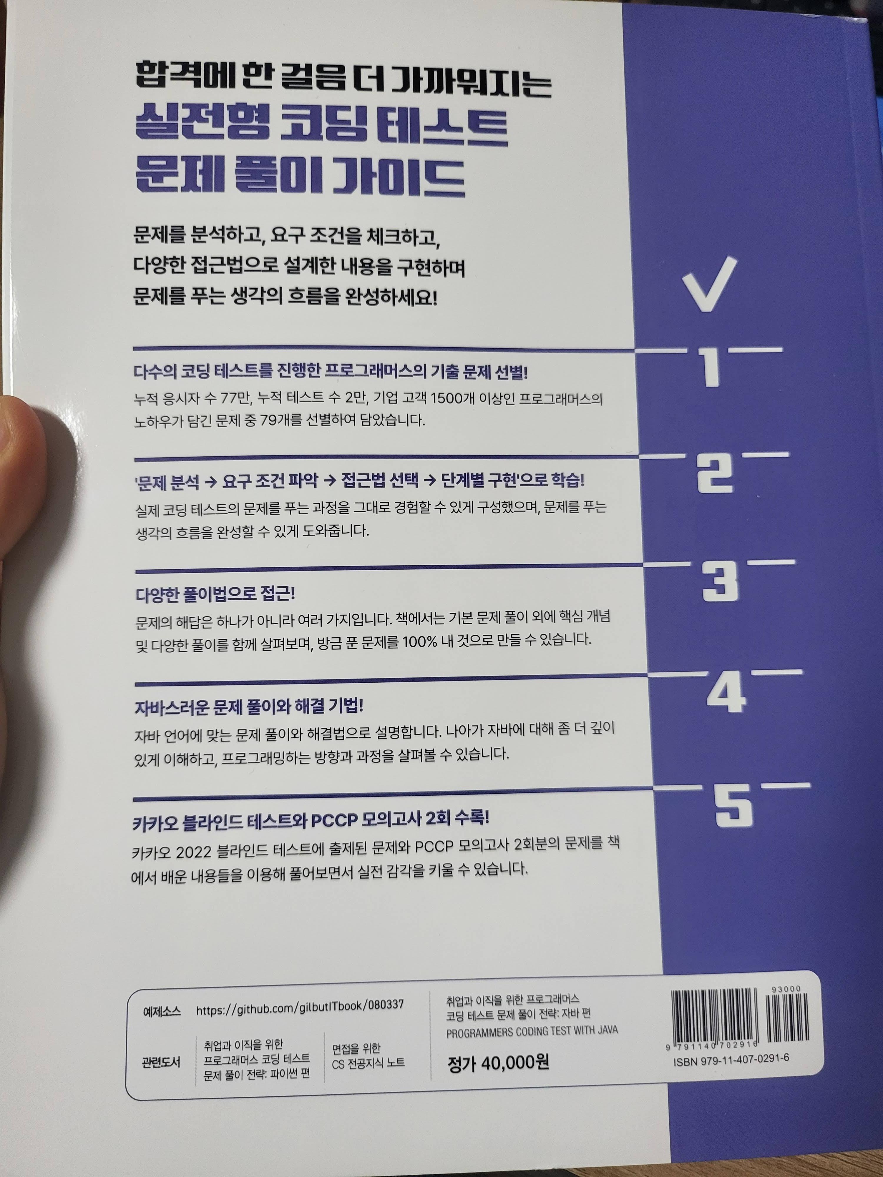 이 책의 뒷표지에는 책의 장점을 어필하고 있다. 프로그래머스의 기출문제를 다루고 있다는 점과, 문제 푸는 과정을 그대로 책에 수록하였다는 점. 그리고 다양한 풀이법으로 접근한 내용과, 자바스러운 풀이 기법의 사용. 추가로 카카오 블라인드 테스트와 PCCP 모의고사 내용에 대해서도 추가함으로써 실전에 더욱 가까이 다가가고 있음을 이야기 해주고 있다.