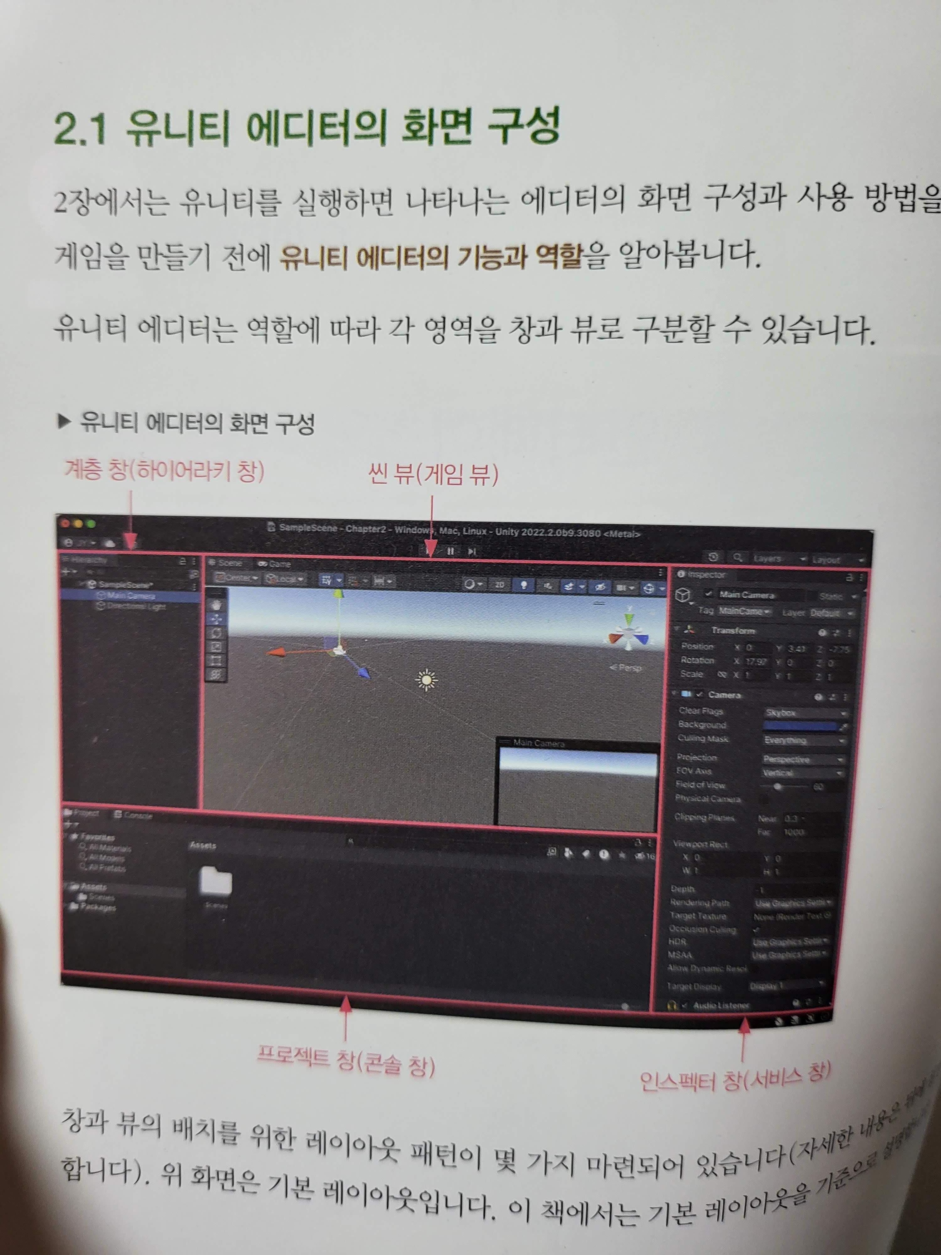 이 책은 초반에 바로 따라하기 예제가 담겨있지 않다. 그보다 더 중요한 것이 이 에디터, 즉 유니티 에디터에 대한 설명이 필요하다고 생각했던 것 같다. 그래서 화면의 각 영역에 대한 설명을 잘 기록하였다. 그리고나서 그 다음 장부터 실제 게임을 만드는 부분이 시작된다.