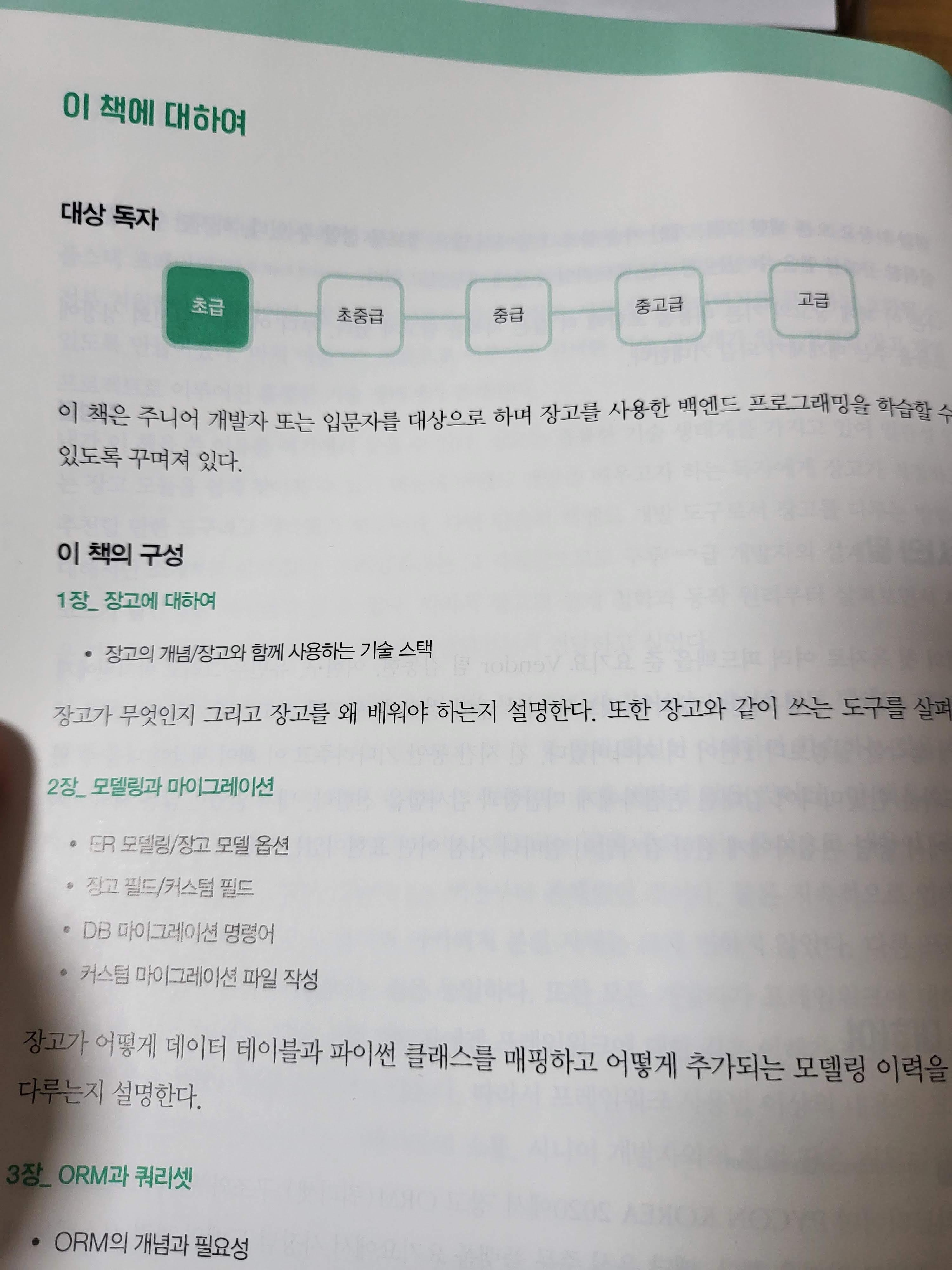 목차 구성 초반을 보면 알겠지만, 놀랍게도 파이썬에 대한 직접적인 언급은 없다. 모델링과 마이그레이션, ORM과 쿼리셋이다. 물론 이 뒤에도 별반 차이는 없었다. 즉 저자가 중요하게 생각하는 부분이 어떤 것인지 짐작할 수 있다.