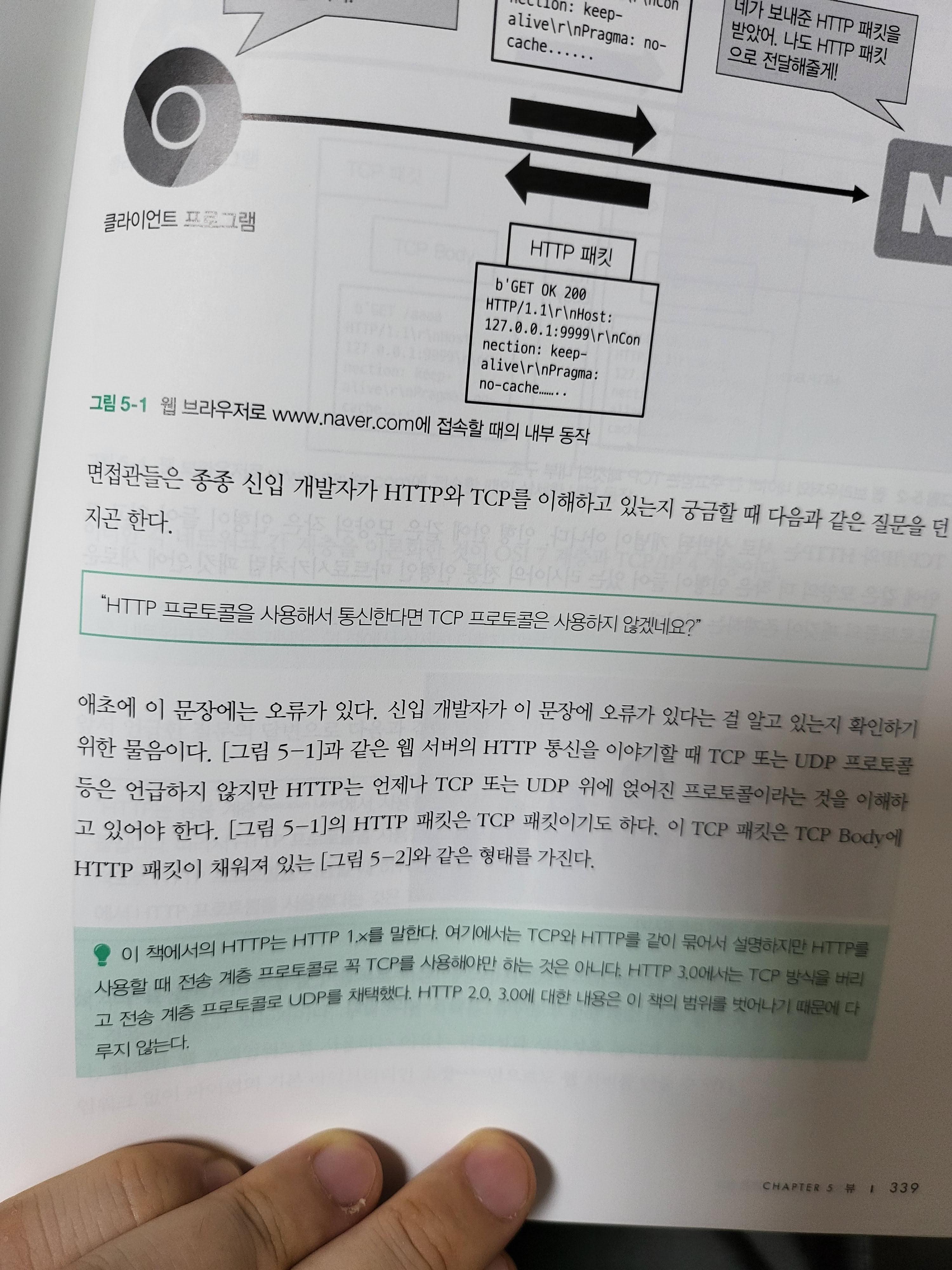 이 책의 특징으로는 뜬금없이 면접관이 등장한다는 사실이다. 갑자가 면접을 본다면 이렇게 하라는 부분과, 면접에서는 이렇게 나올 수 있다는 등의 의문을 할 경우가 있다. 이 부분도 동일한데, 프로토콜에 대한 이해를 하고있는지 설명하기 위해 도입한 내용이다. 주니어 개발자라도 요즘은 많이들 이해하고 있을 수 는 있지만, 별 생각없이 보고 있었다면 제대로 이해하지 못하고 있을지도 모른다. OSI 7계층까지 굳이 들어가지 않더라도, 우리가 개발할 때 HTTP는 어떤 목적에서 사용하며, TCP는 어떤 목적에서 사용하는지 안다면 당연히 각 프로토콜의 단계가 다르다는 것을 알 것이고, 그렇다면 저 질문은 바보같은 질문이라는 사실을 알게된다는 것이다. 그래도 확실히 주니어를 목표로 잘 알려주려 했다는 사실을 알 수 있는 부분이었기에 좋았다.