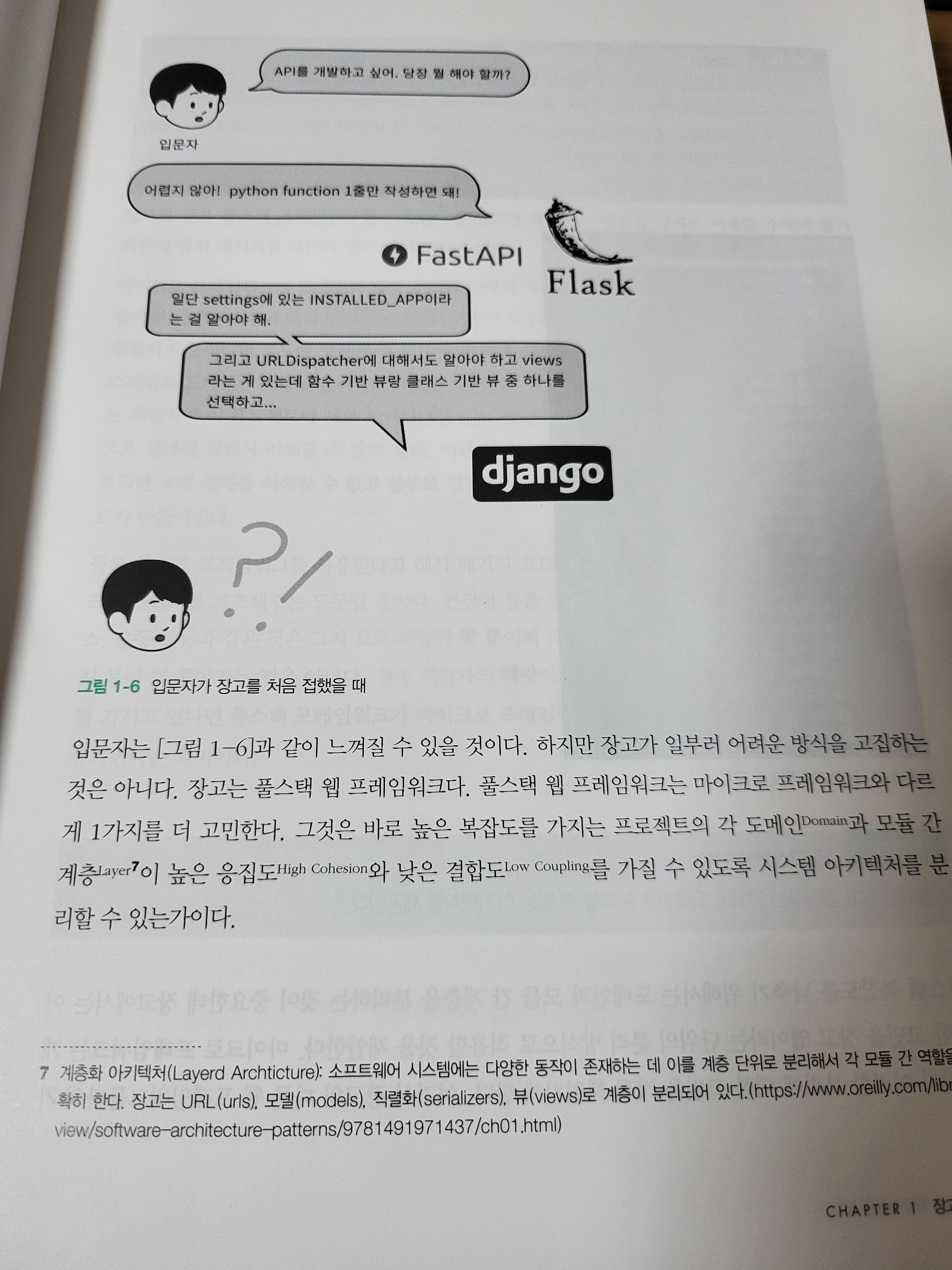 Python을 이용한 백엔드 개발 프레임워크로 유명한 FastAPI 및 Flask에 비해 django가 갖는 불편한 인식에 대해 말하고 있다. 이에 대한 이유를 말해주고 있다. django는 풀스택 웹 프레임워크이며, 이는 마이크로 프레임워크인 FastAPI, Flask와는 다르다. 풀스택 프레임워크는 높은 복잡도를 가지는 프로젝트의 각 도메인과 모듈 간 계층이 높은 응집도와 낮은 결합도를 가질 수 있도록 시스템 아키텍처를 분리할 수 있는가에 대한 것이다. 장고는 장고 앱이라는 단위의 분리 방식으로 적용할 것을 제안하고 있다고 답하고 있다.