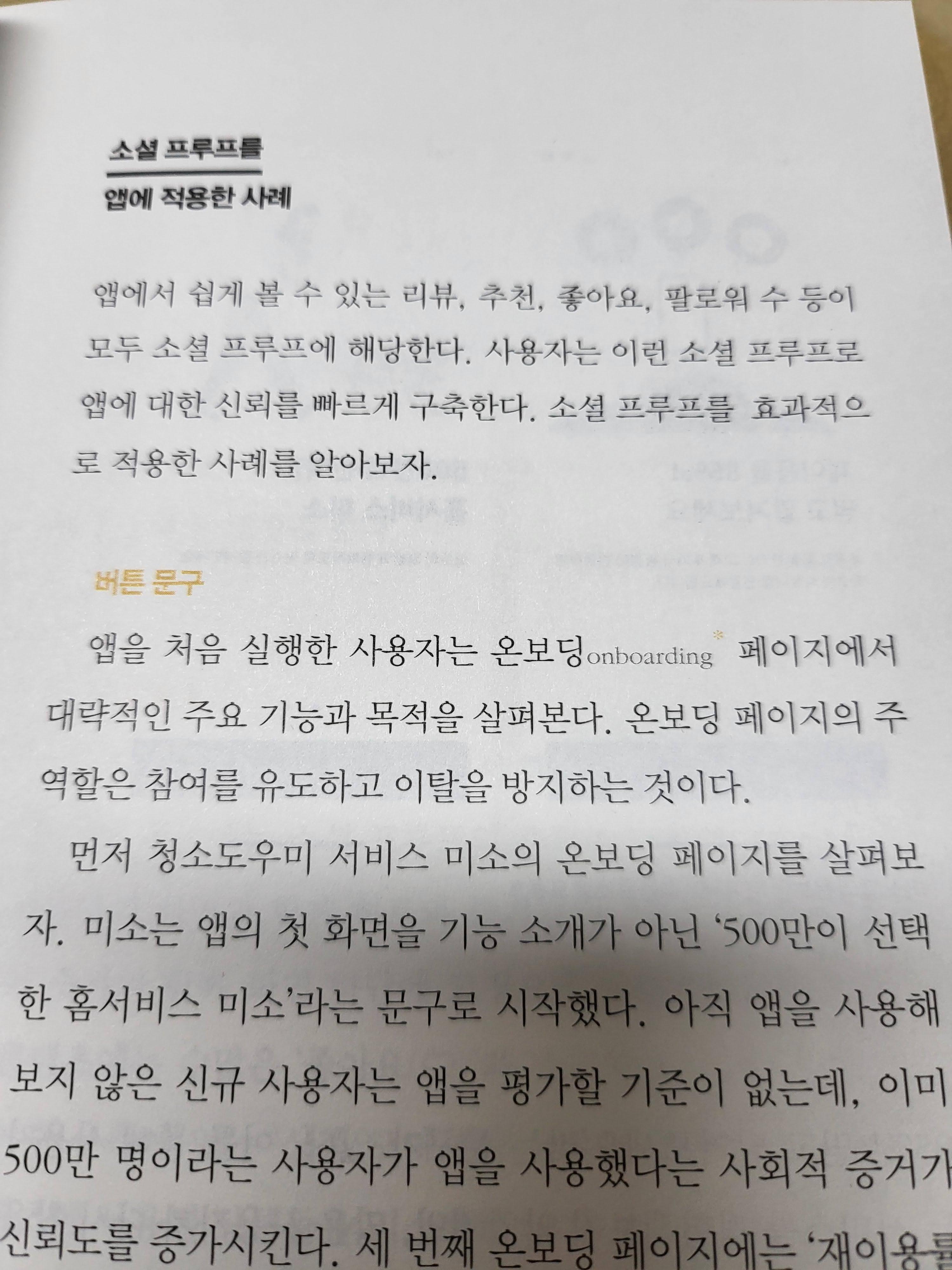이 책에는 업계 용어가 많이 나온다. 게임처럼 UX를 적용시키는 '게이미피케이션', 정보가 거의 없거나 스스로 분명한 답을 가지고 있지 않아서 다른 사람의 정보를 활용한다는 '소셜 프루프', '핍진성과 개연성', 'MVP-minimum viable product' 등 다양한 용어를 가지고 오지만 이것을 잘 풀어서 알려주어 이러한 용어가 전혀 위화감을 조성하지는 않았다. 그래서 다양한 용어를 배울 수 있었으며 이 책에서 주는 큰 장점 중 하나라고 생각했다.