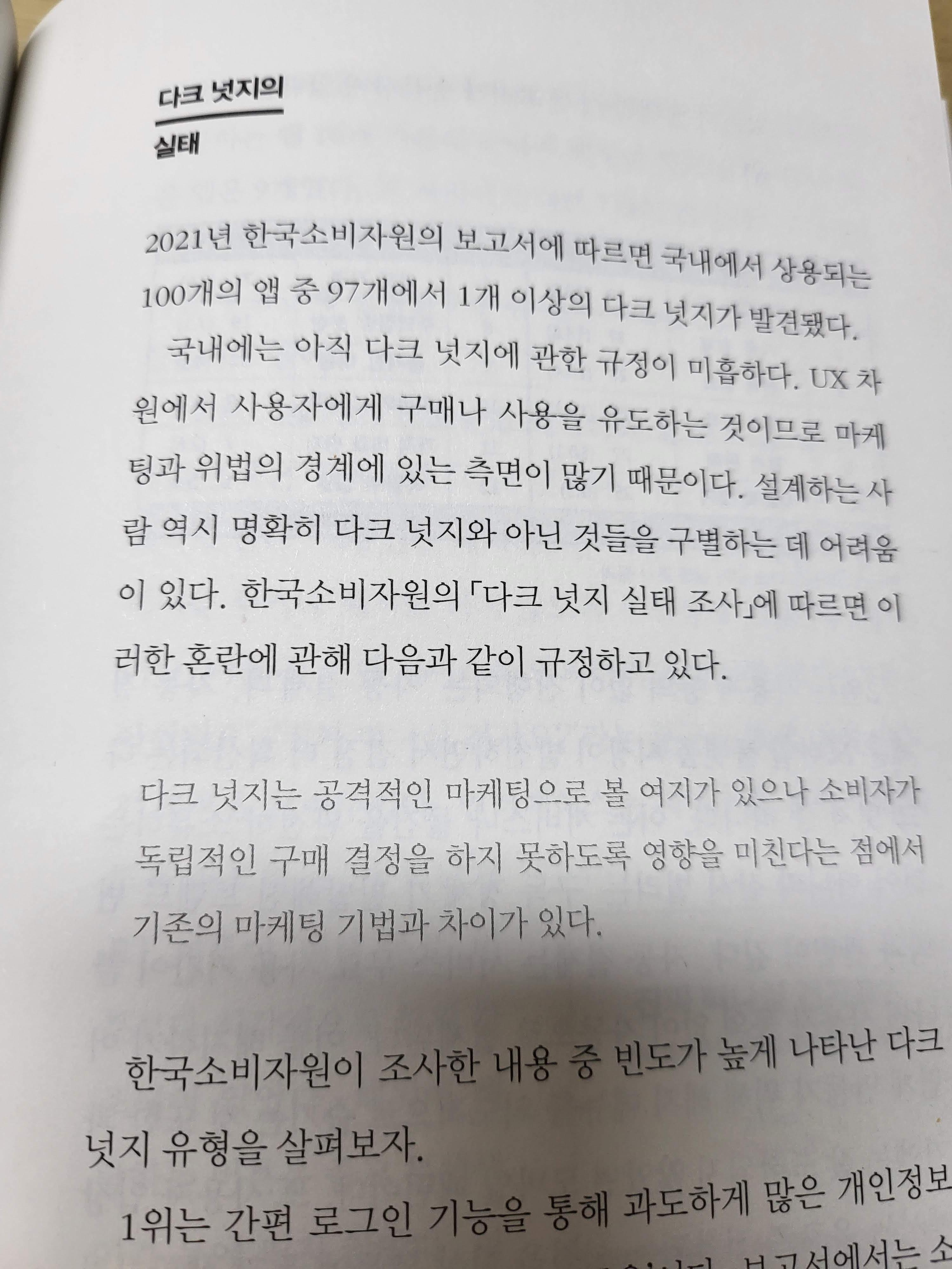 디지털 공해에서 벗어나는 방법 등 주요 주제와는 거리가 있는 내용이 적혀있다는 생각이 든다. 흐름상 자연스러웠지만, 디자인에 대한 여러 개념과 UX의 원리 등에 대해서 잘 설명하는 부분들이 진행되다가 중간 부분에서 갑자기 스마트폰의 위험성을 다루기도 하고 SNS의 위험성을 다루기도 한 부분을 보면서, 이 부분이 '사실은 이것도 디자인입니다'라는 책의 어떤 부분을 담당하고 있는지 이해가 잘 가지는 않았다. 좀 더 중심주제와 어떤 연관이 있는지 설명이 필요한 부분이라고 생각된다.