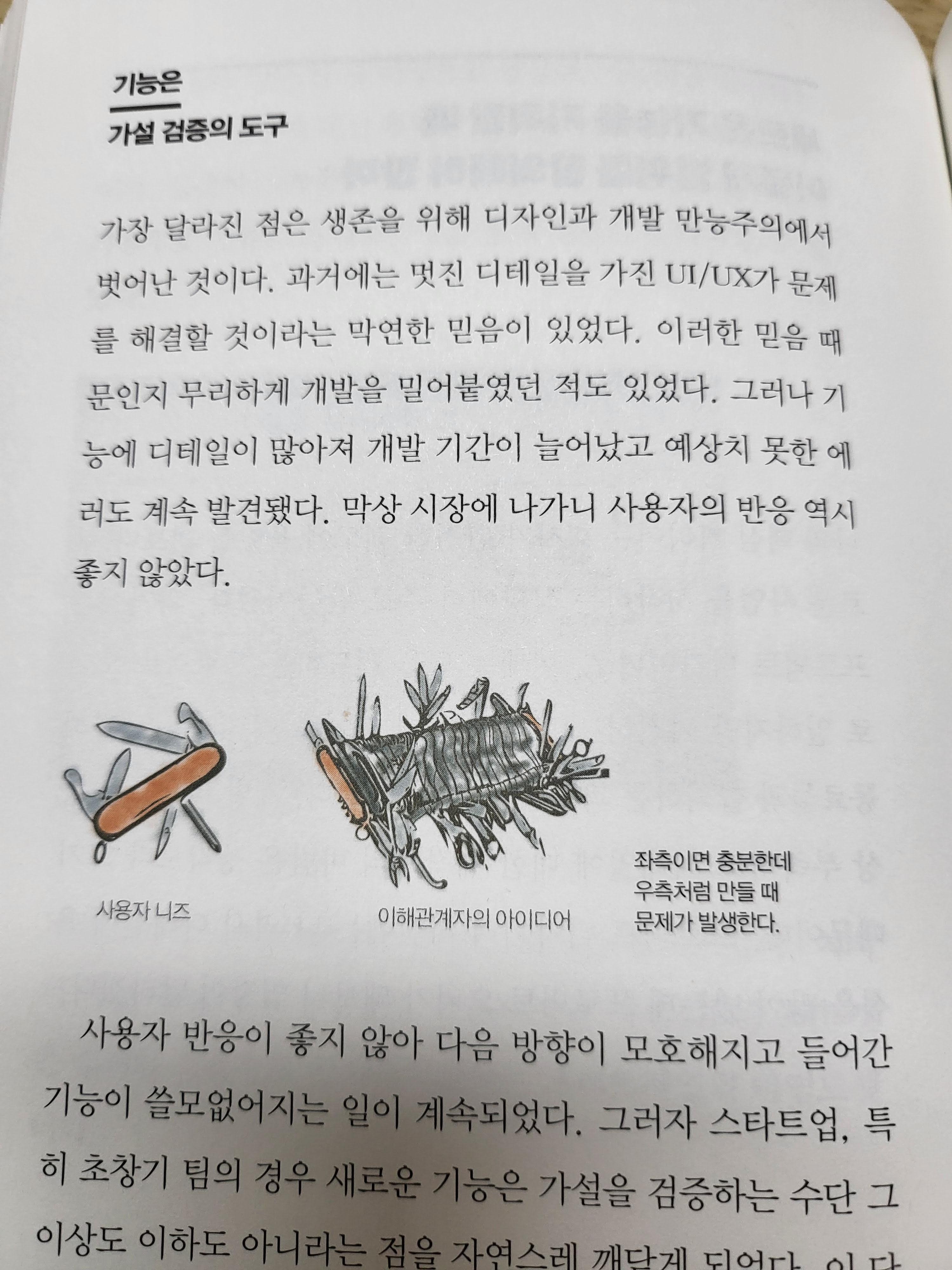 많지 않더라도 그 기능을 오히려 탄탄하게 만들어야 사람들이 그 서비스를 잘 사용하지 않을까 하는 생각이 있는데, 이 책의 지적처럼 사업 기획 부서를 비롯한 이해관계자들의 입김이 들어가기 시작하면, 단순한 서비스가 되지 못할 가능성이 높아진다.