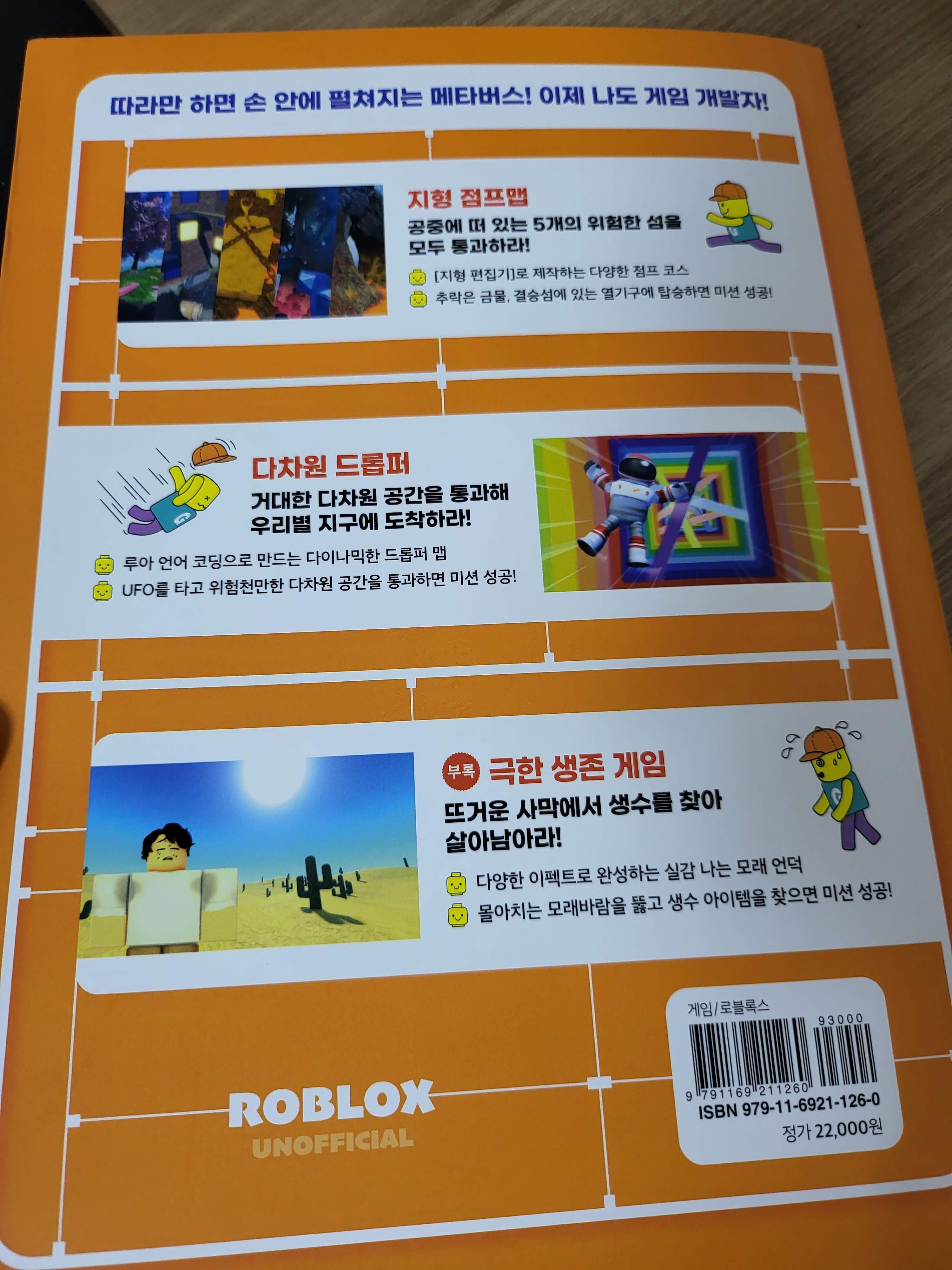 게임 만들기를 통해서는 지형 점프맵, 다차원 드롭퍼, 극한 생존게임(별도의 전자책)을 제공하고 있으며, 수익 올리기를 통해서는 게임을 배포한 이후 이것을 통해 로벅스를 벌 수 있도록 알려주고 있다.
