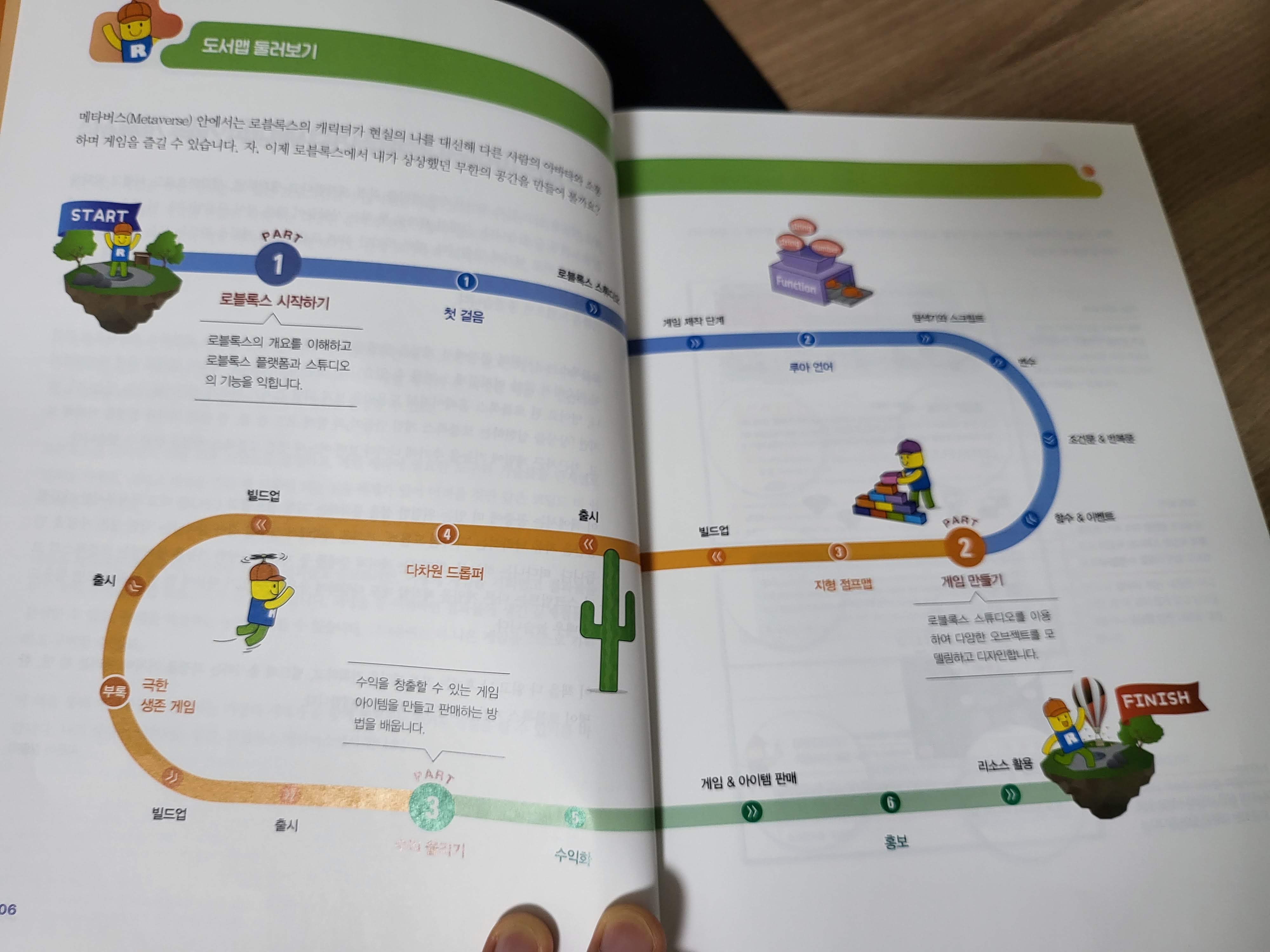 유니티, 언리얼로 크게 양분되어 게임을 만들 수 있는 요즘 시대에, 로블록스로 게임을 만들면 그에 비해 상당히 적은 노력으로도 게임을 만들 수 있다는 성취감을 준다. 그것을 이 책을 통해 익힐 경우 좀 더 쉽다는 느낌을 주어 친근감을 느끼게 한다. 많은 페이지를 통해 진행한 것은 아니지만 점프맵 하나가 완성되며, 그것을 통과하려고 애쓰다보면 나름 하나의 게임 역할을 하고 있다는 느낌을 주기 때문이다. 재료를 충분히 준비해주어, 나는 간단히 몇개의 과정만 진행하면 게임이 완성되기 때문이다.