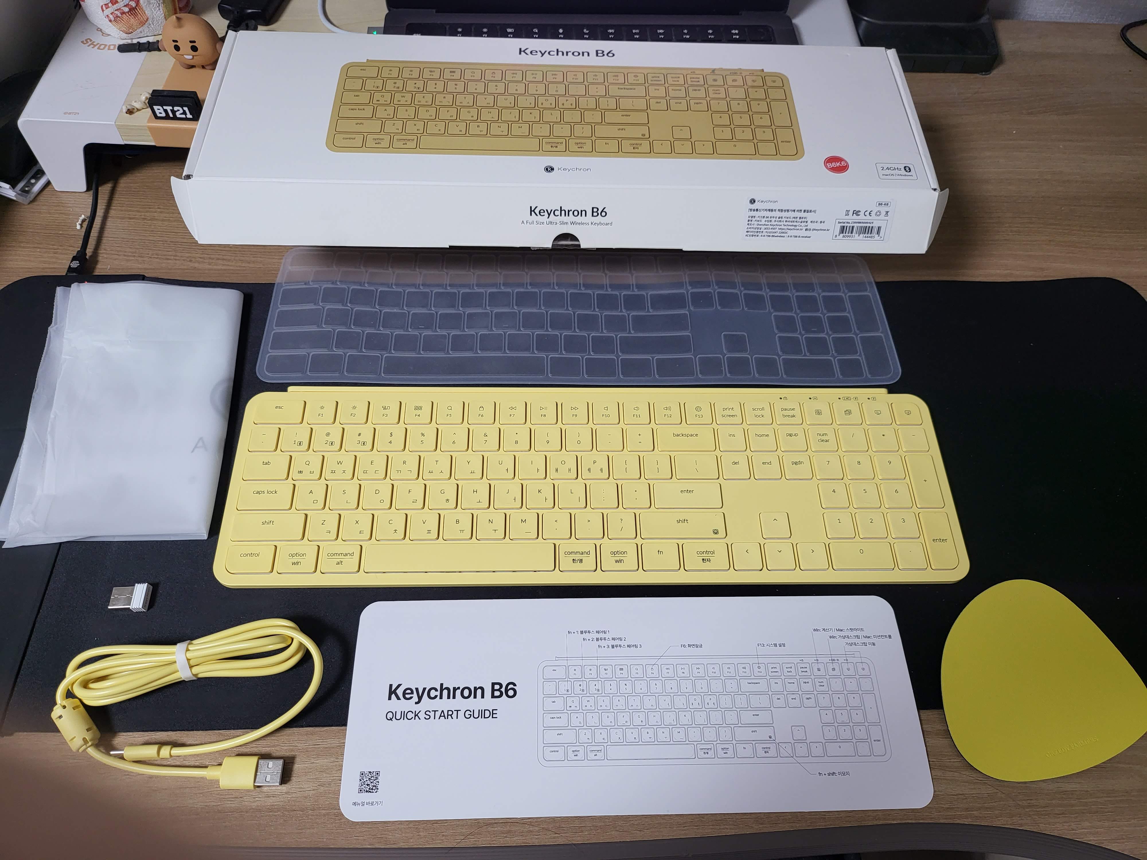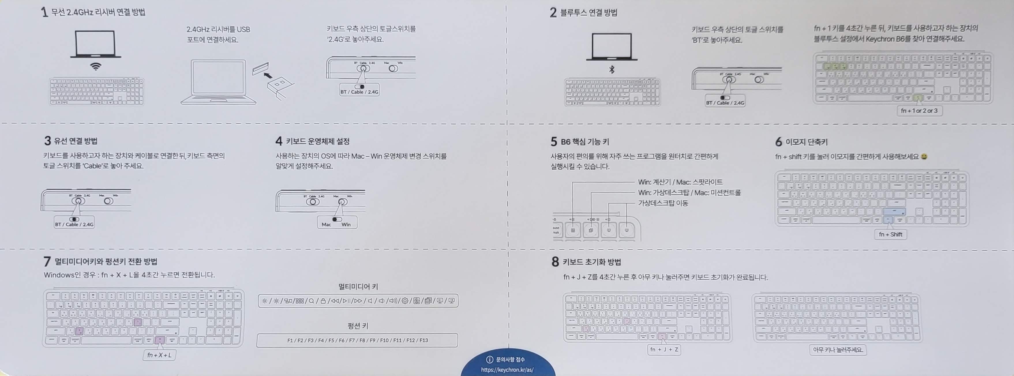 전체적으로 박스, 실리콘덮개, 키보드 본체, 퀵가이드, USB 케이블, 2.4G 리시버, 내부포장지로 구성되어 있다.