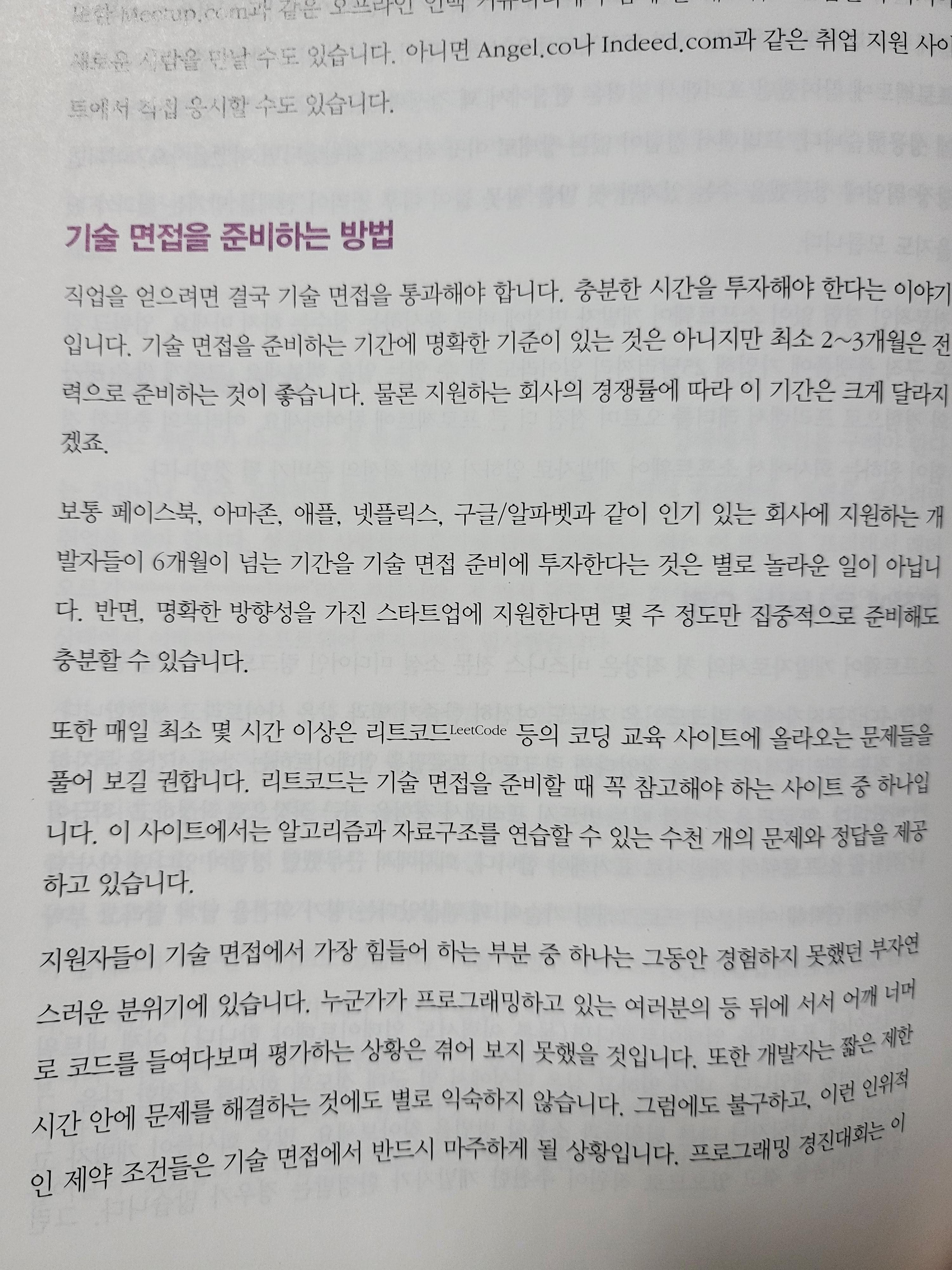 아무래도 이 책은 기술면접을 앞두고 있는 취업준비생 혹은 이직준비하는 사람들에게 많이 읽힐것으로 보고 이런 내용을 담은 것으로 보인다. 사실 이 책에서 말하고 있듯이 매일 최소 몇 시간 이상을 리트코드(leetcode)를 풀며 보낼 수는 없는 것이 현실이겠지만, 최소 한 문제 정도만 목표를 잡고 풀어보는 것은 뇌를 말랑하게 하는 데 도움을 주기 때문에 그정도는 권할 수 있다고 생각한다.